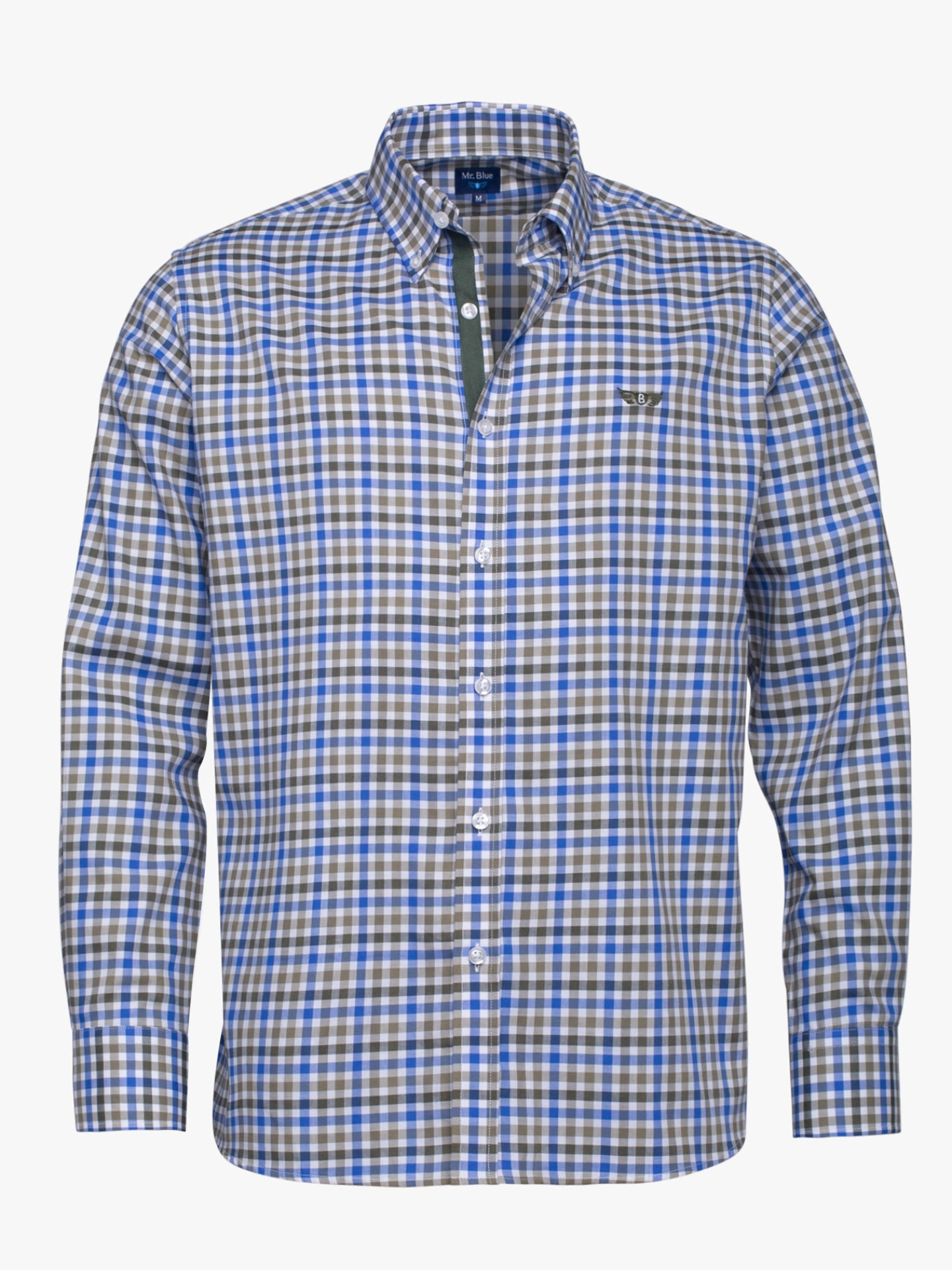Camisa de homem 100% algodão quadrados pequenos branco e verde com logo bordado em verde. Corte regular, fecho mediante abotoadura frontal, tape na carcela e manga comprida com acabamento em punho abotoado.