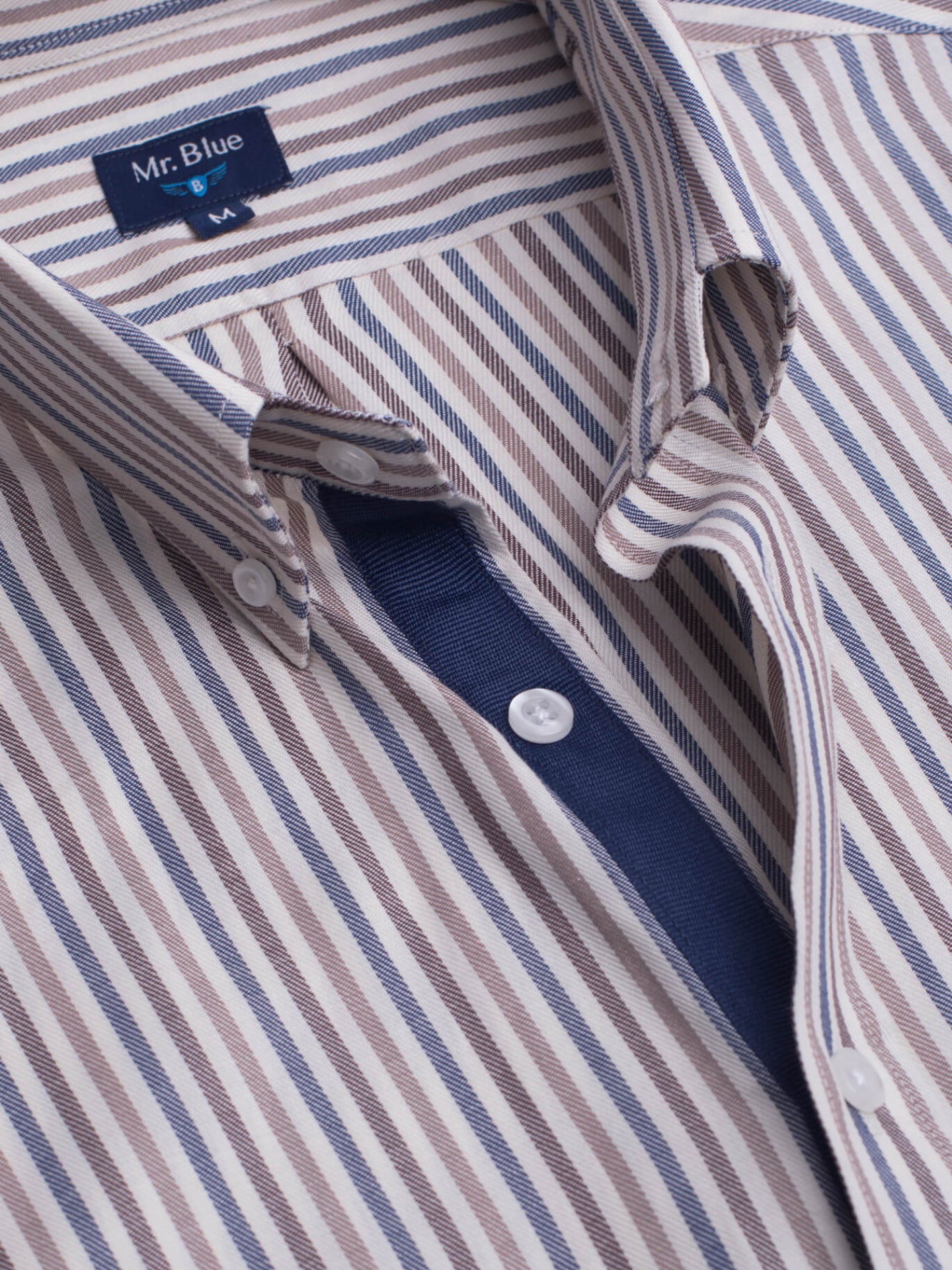 Camisa algodão às riscas azul escuro e vermelho com bolso e detalhes