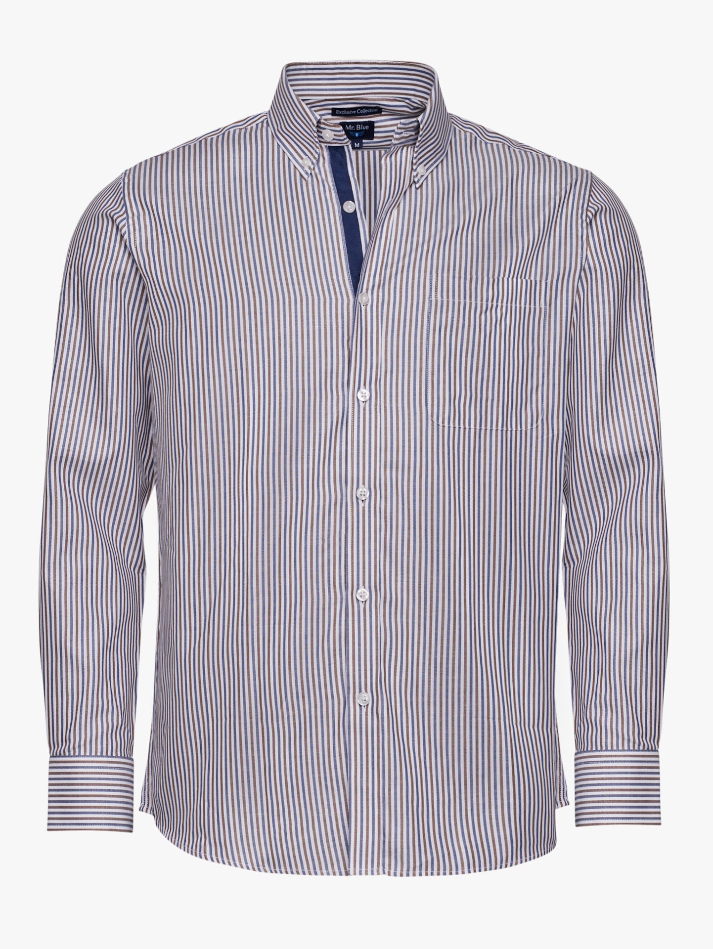 Camisa algodão às riscas azul claro e amarelo com bolso