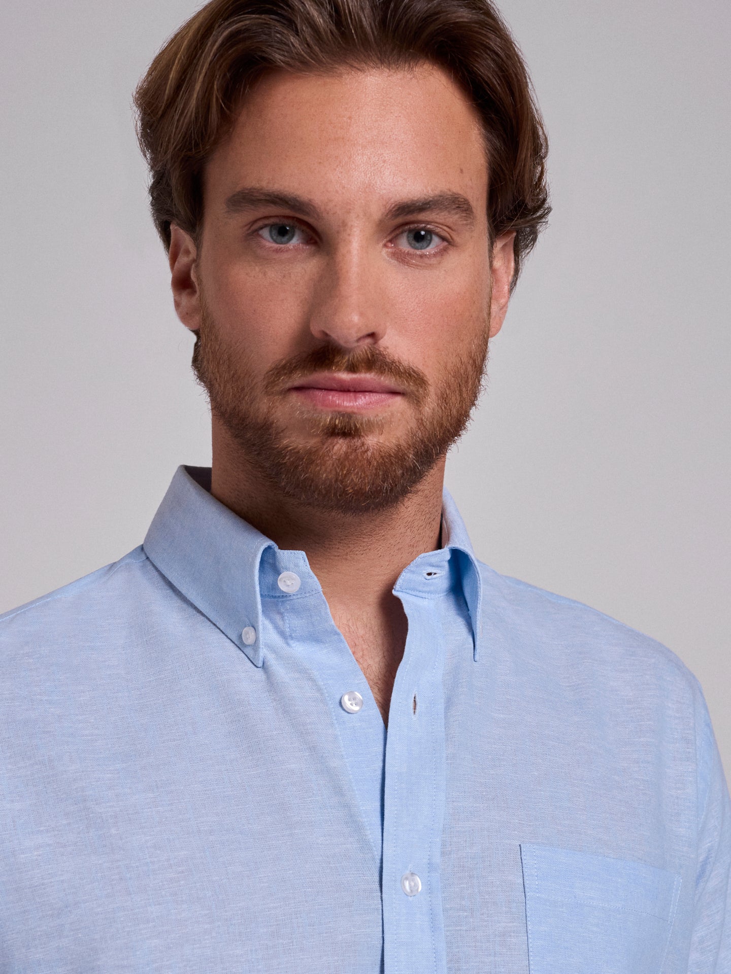 Camisa Linho Linho Azul Manga Curta Regular Fit Com Bolso Lisa