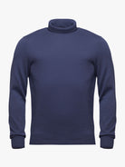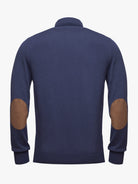 Camisola para homem gola alta lisa azul médio com cotoveleiras em castanho. Confecionada em tecido de algodão e lã merino. Corte reto, gola alta, manga comprida e acabamentos canelados.