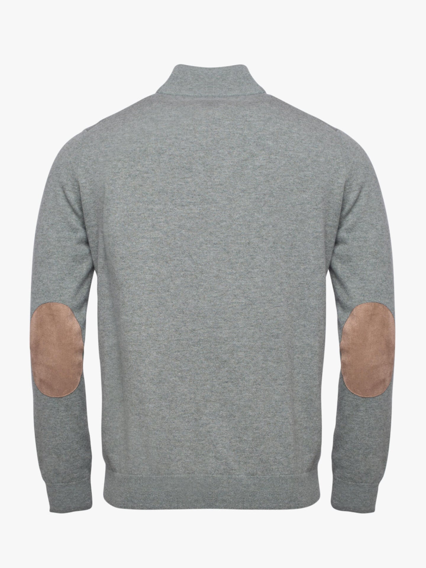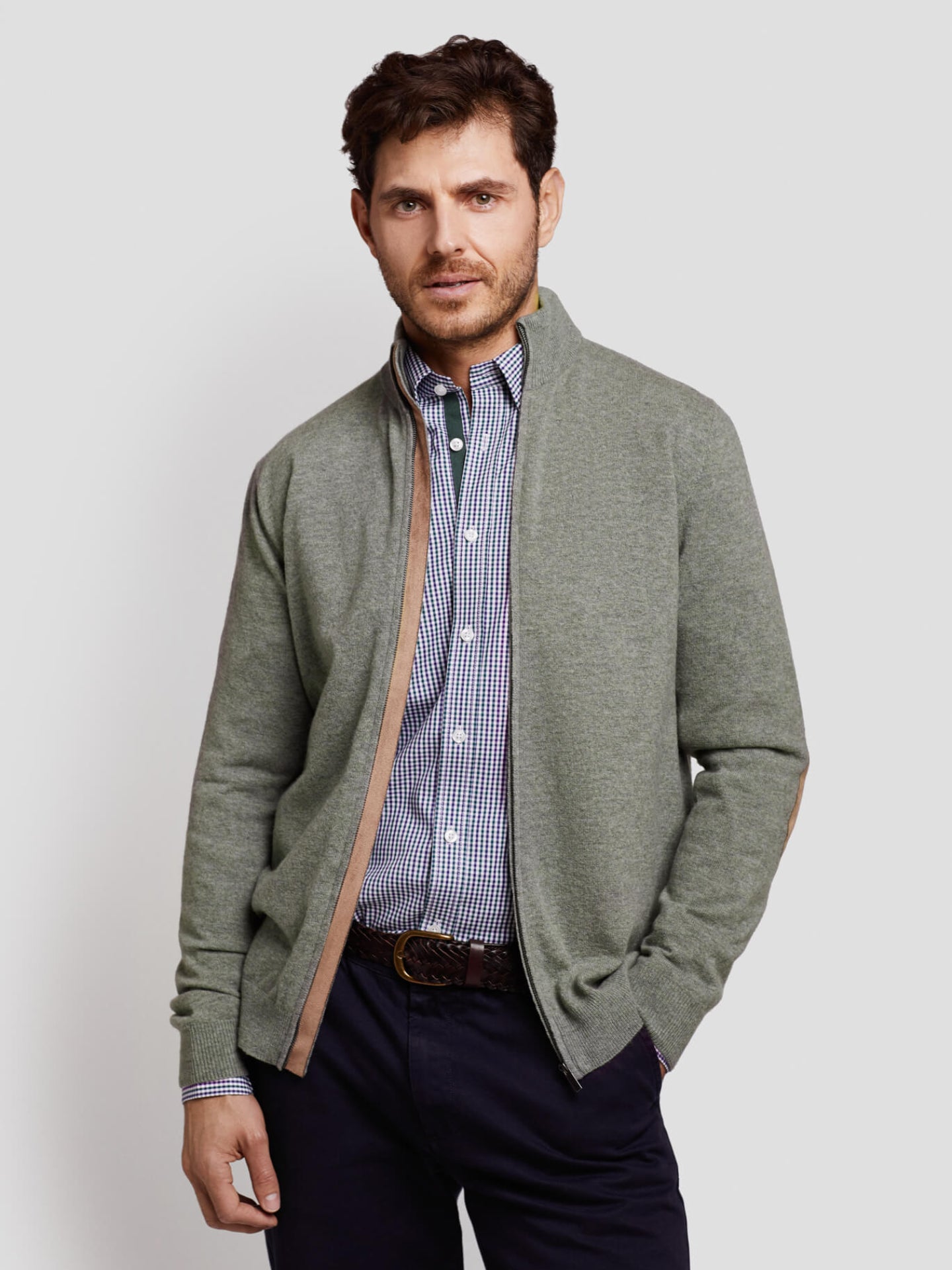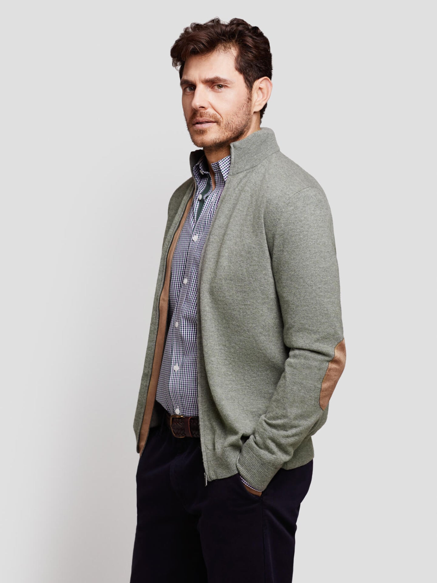 Camisola lã verde médio gola com fecho com cotoveleiras