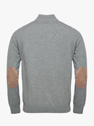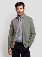 Camisola para homem verde médio com cotoveleiras e detalhe carcela em beige. Confecionada em lã. Corte reto, gola com fecho, manga comprida e acabamentos canelados
