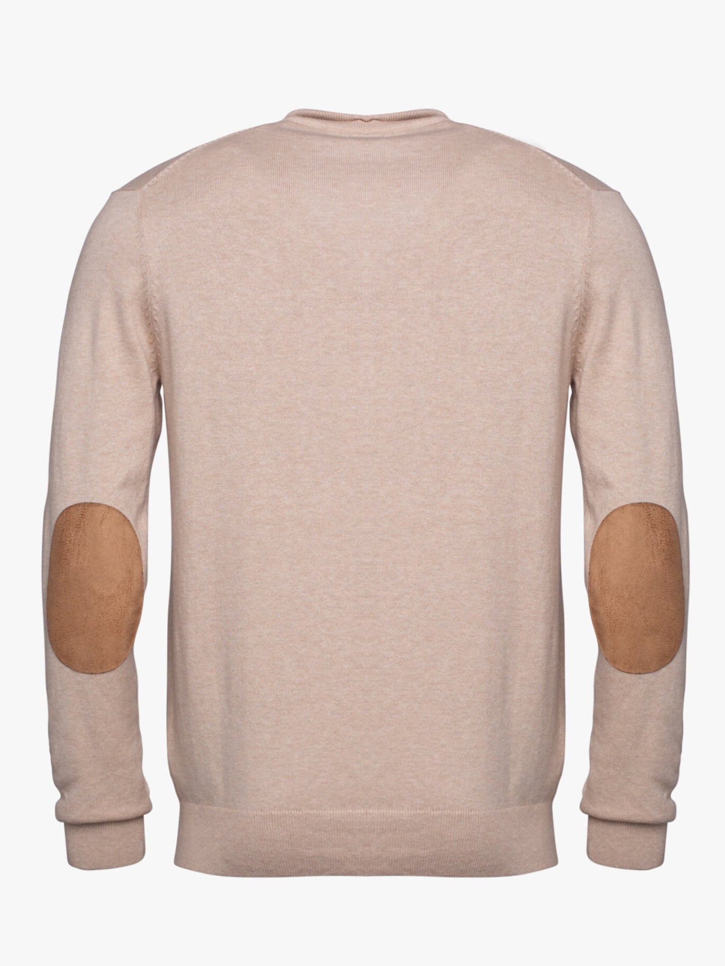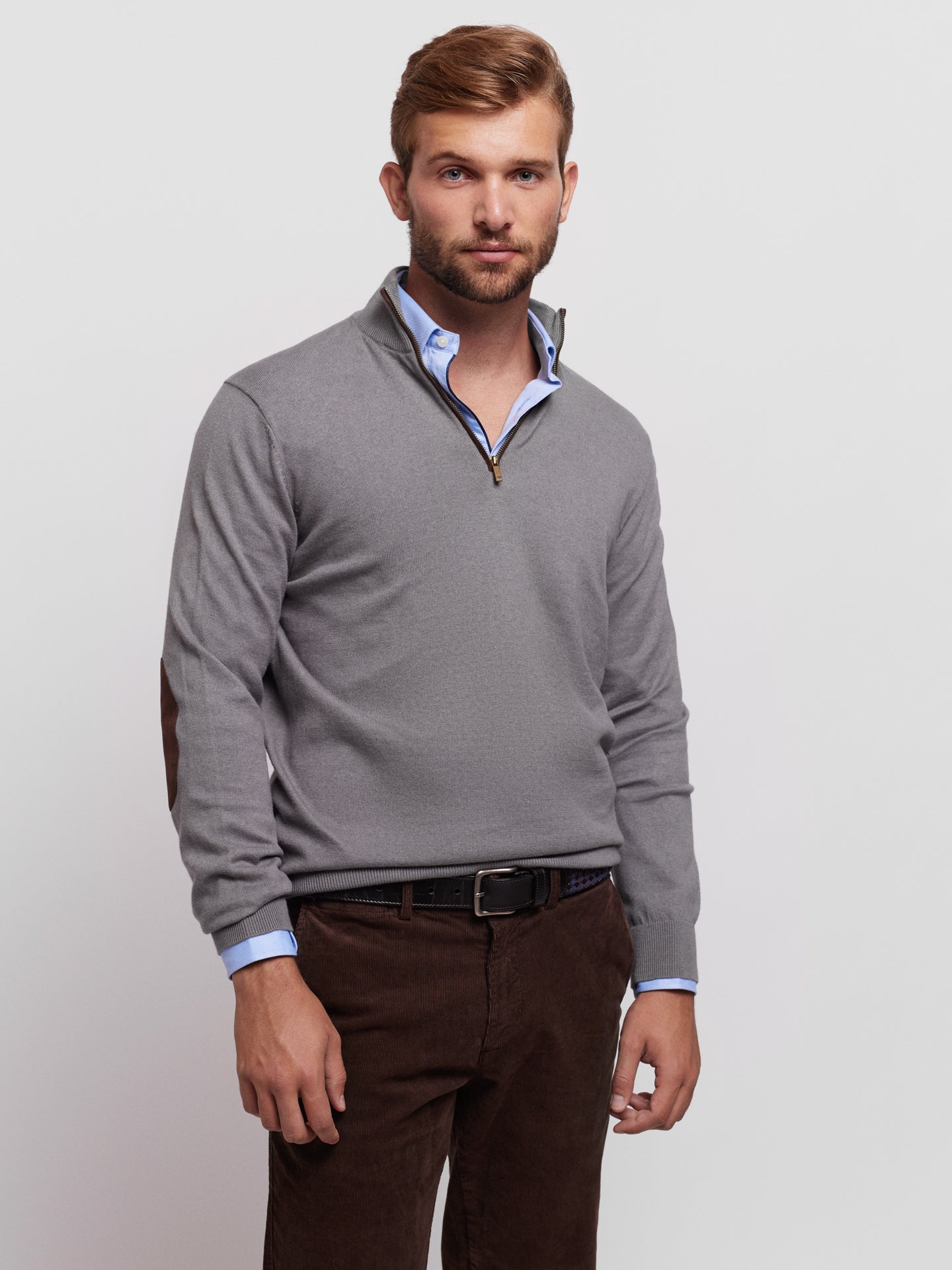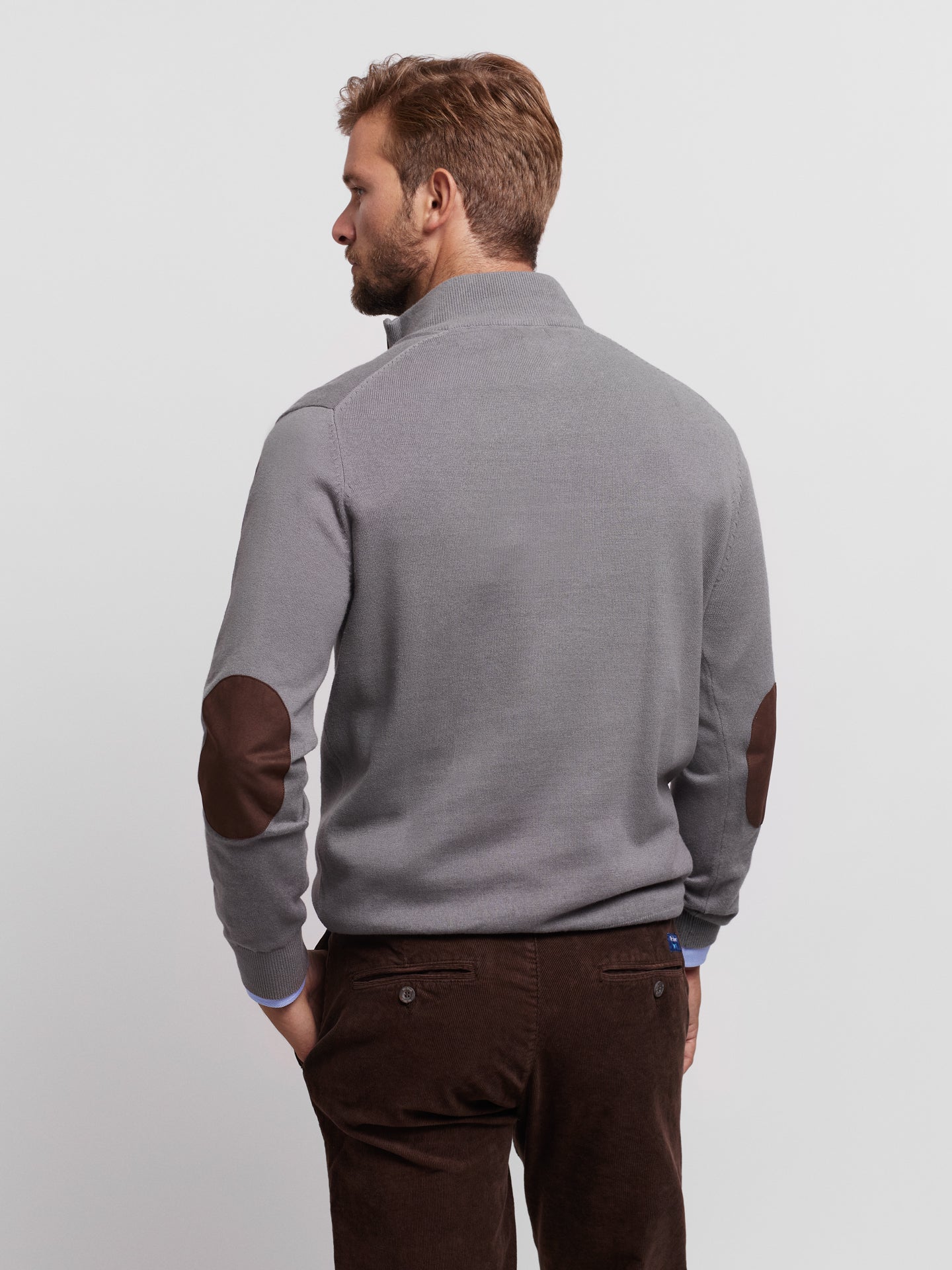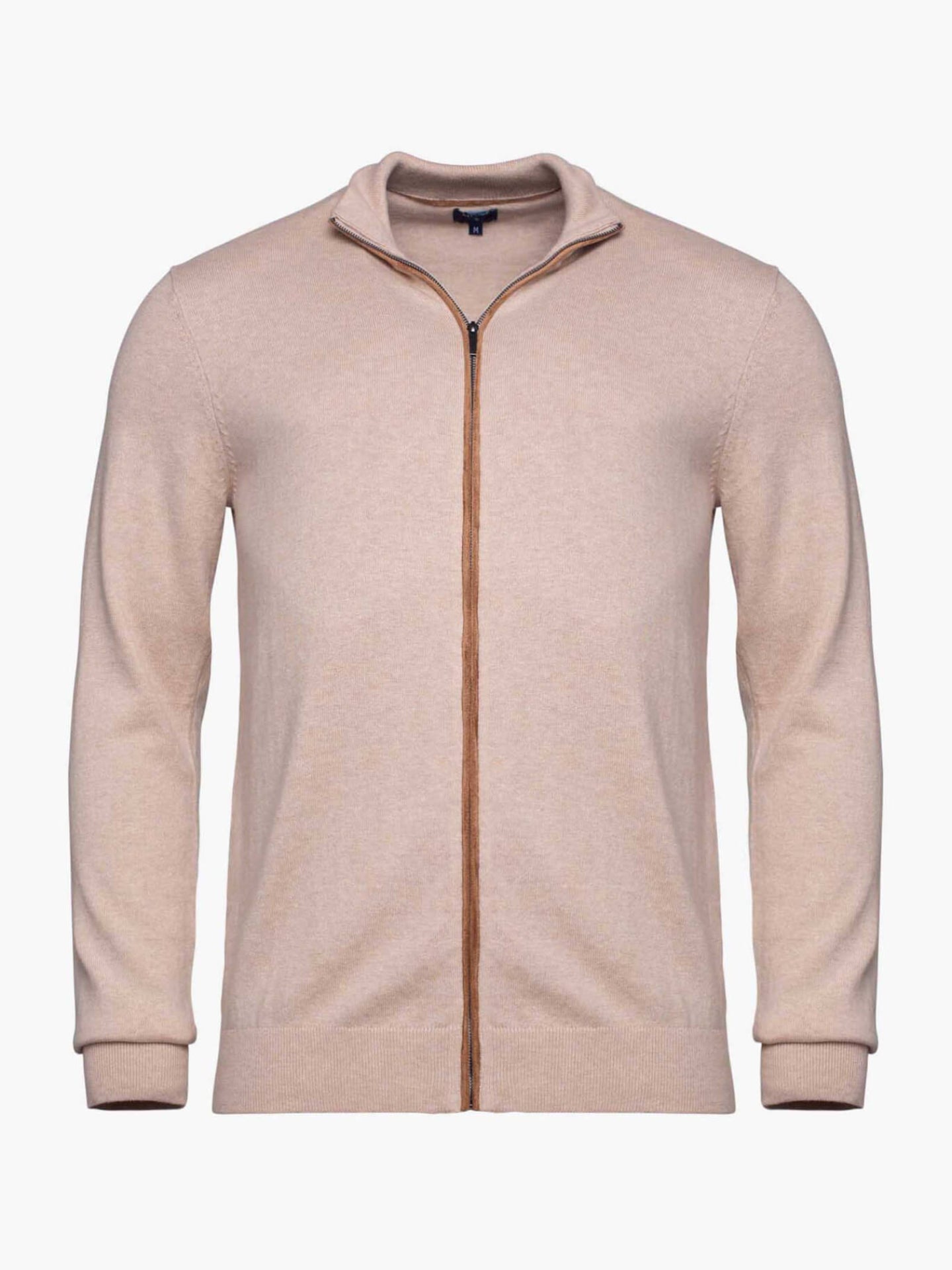 Cardigan beige em algodão e caxemira com fecho de correr e cotoveleiras