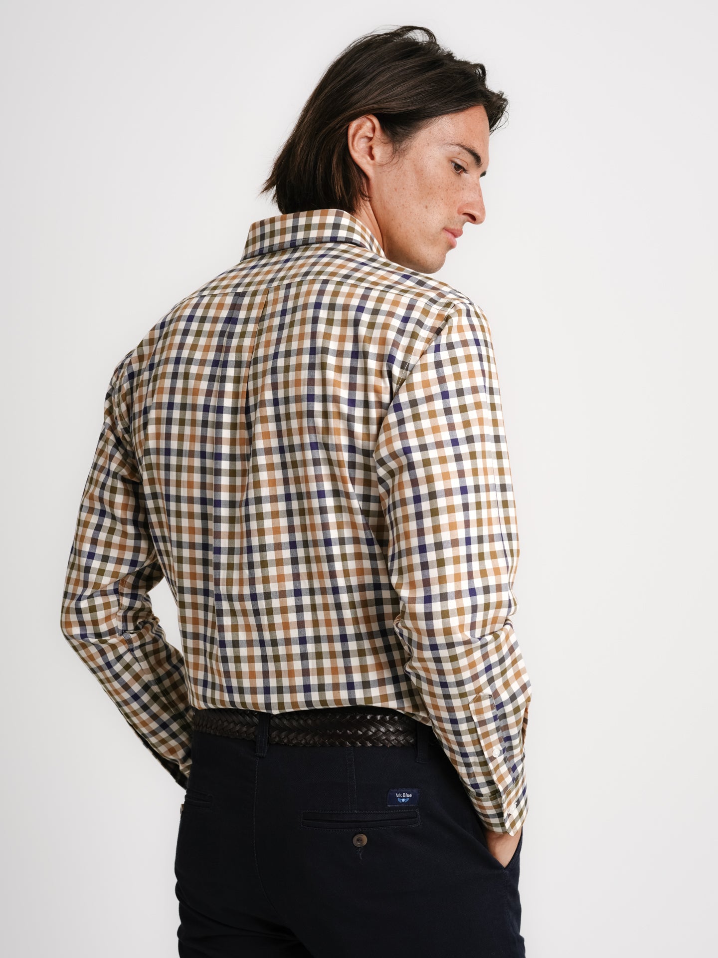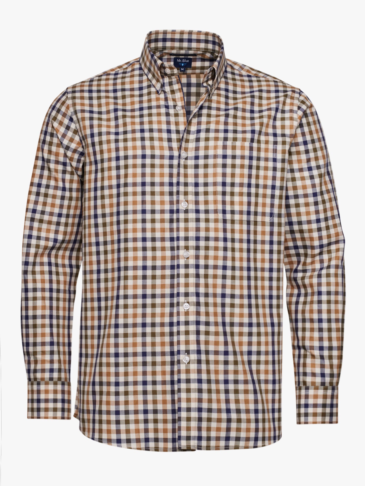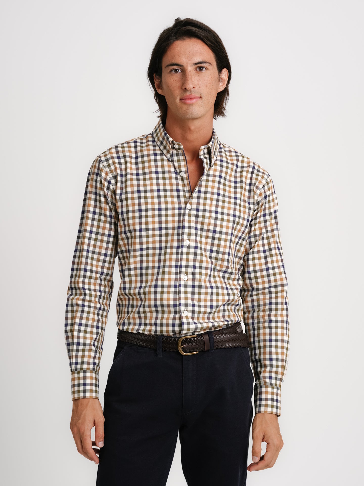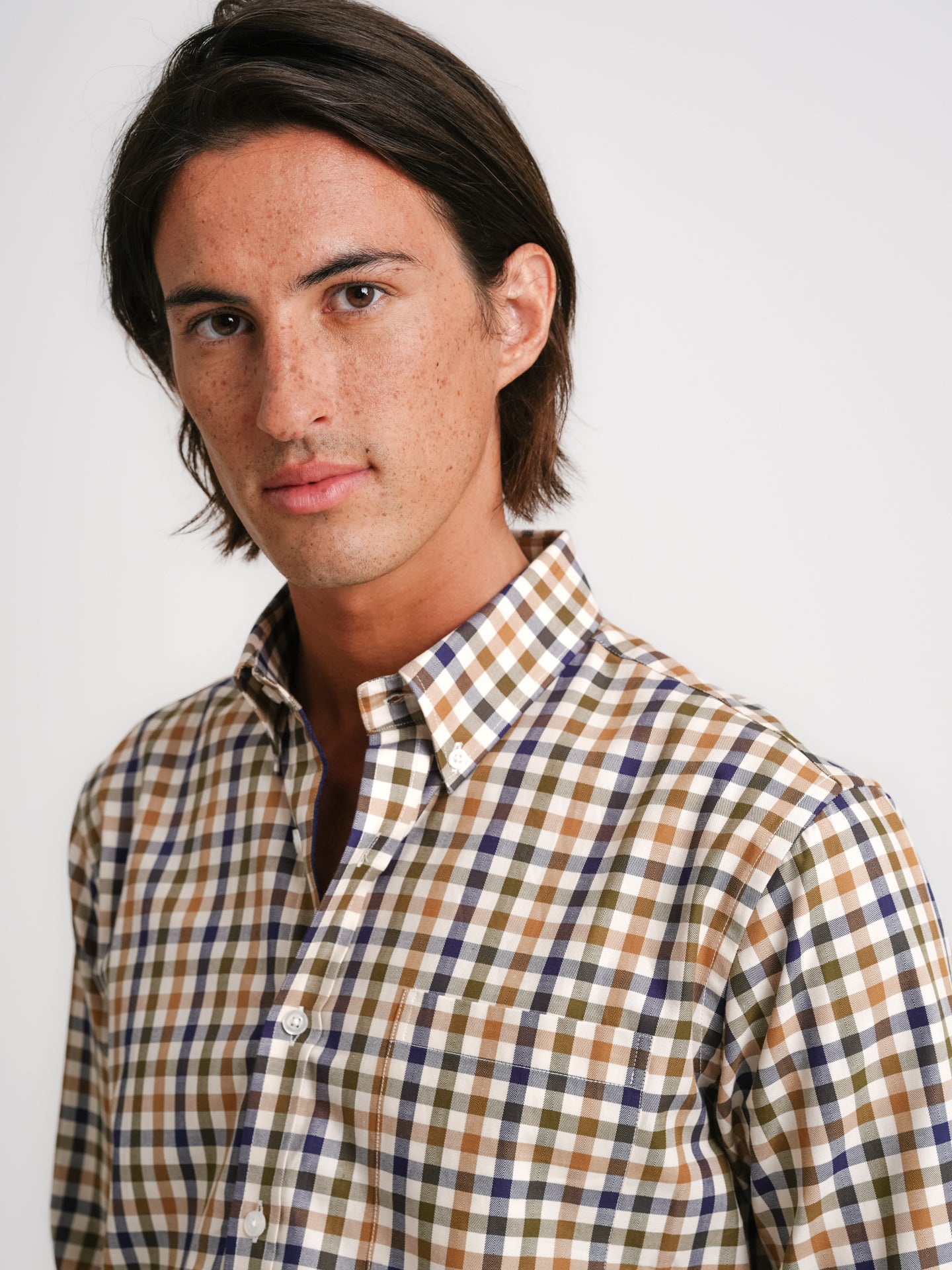 Camisa de sarga de algodón beige a cuadros con bolsillo y corte regular