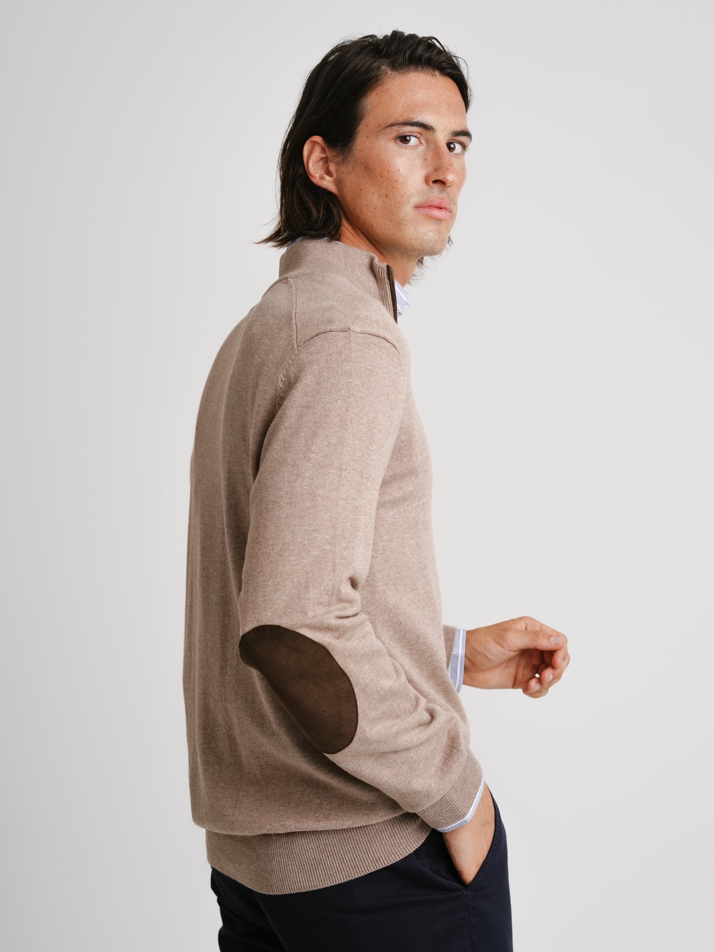 Jersey de cachemira fina con coderas de cachemira beige liso