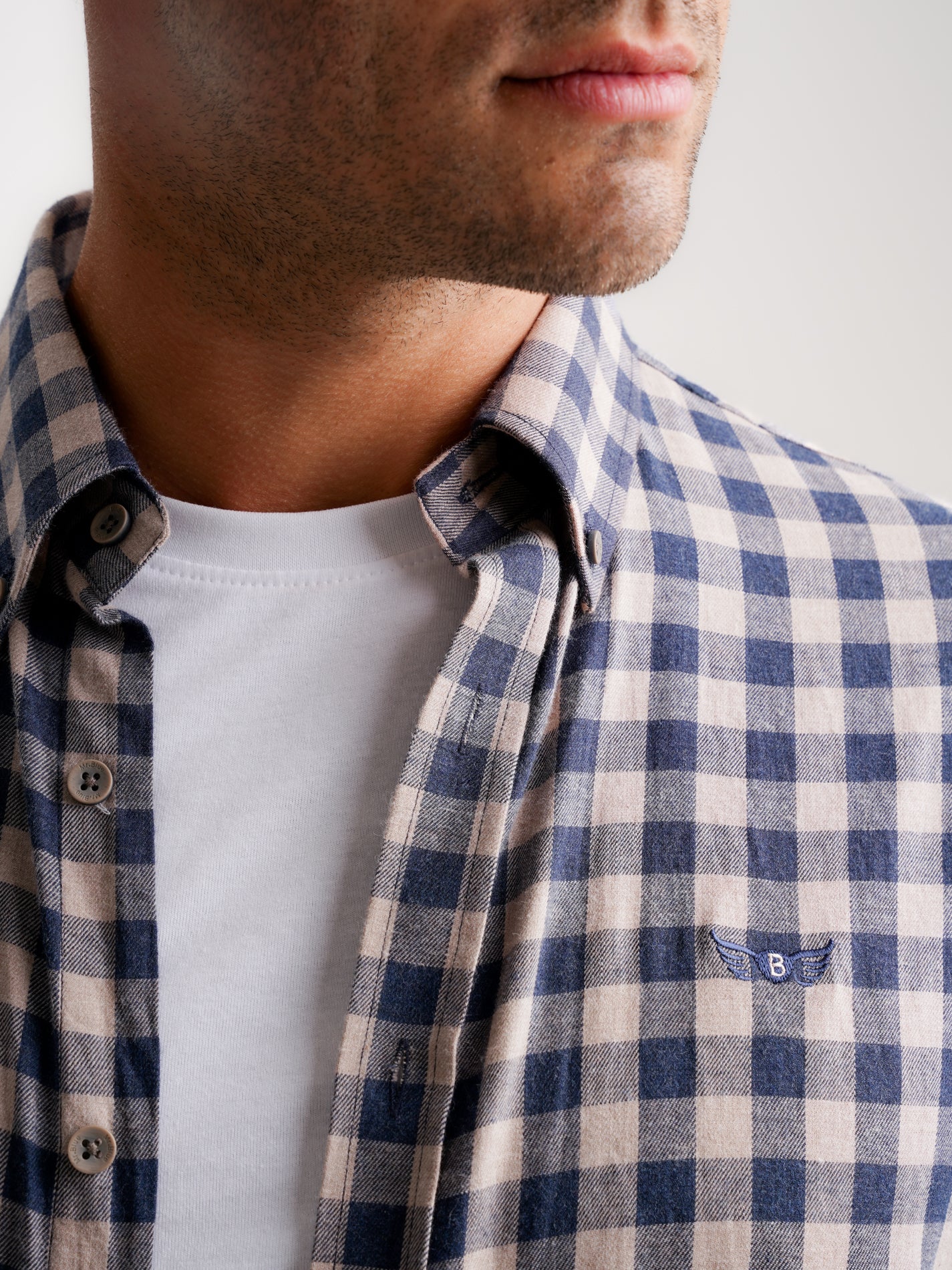 Camisa de franela beige de manga larga y corte regular con logotipo a cuadros