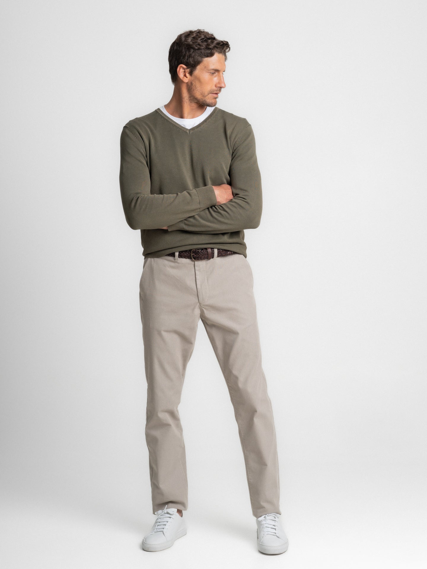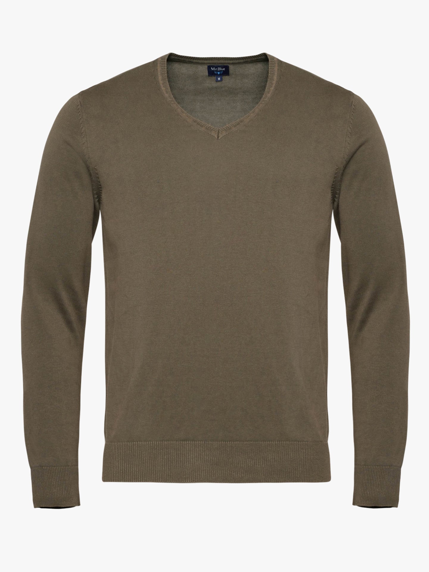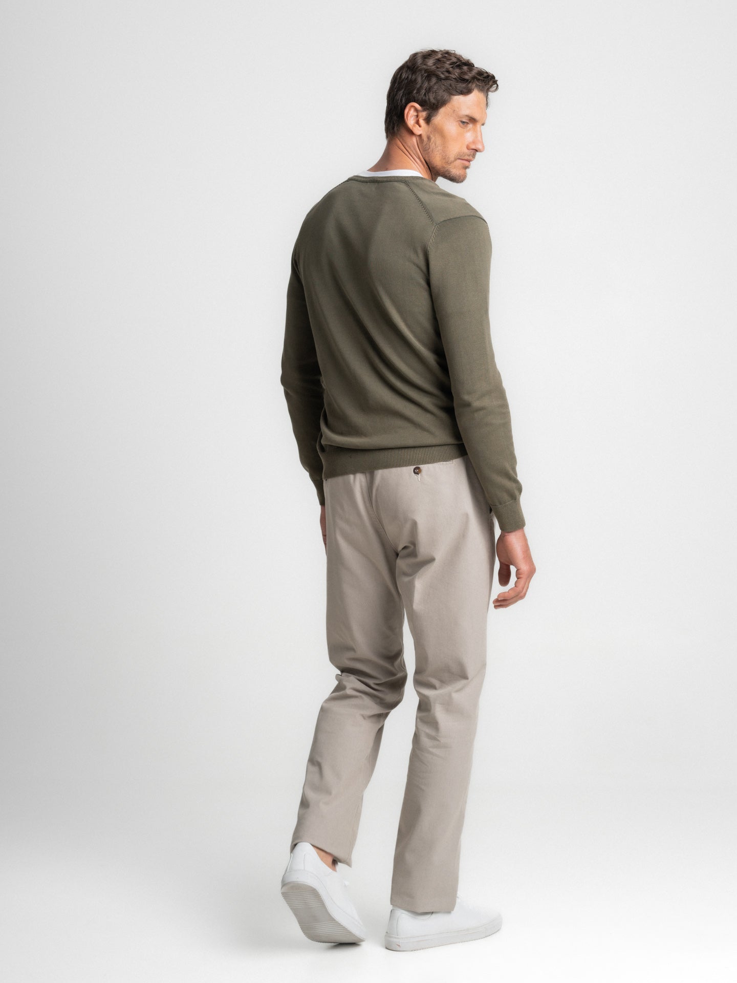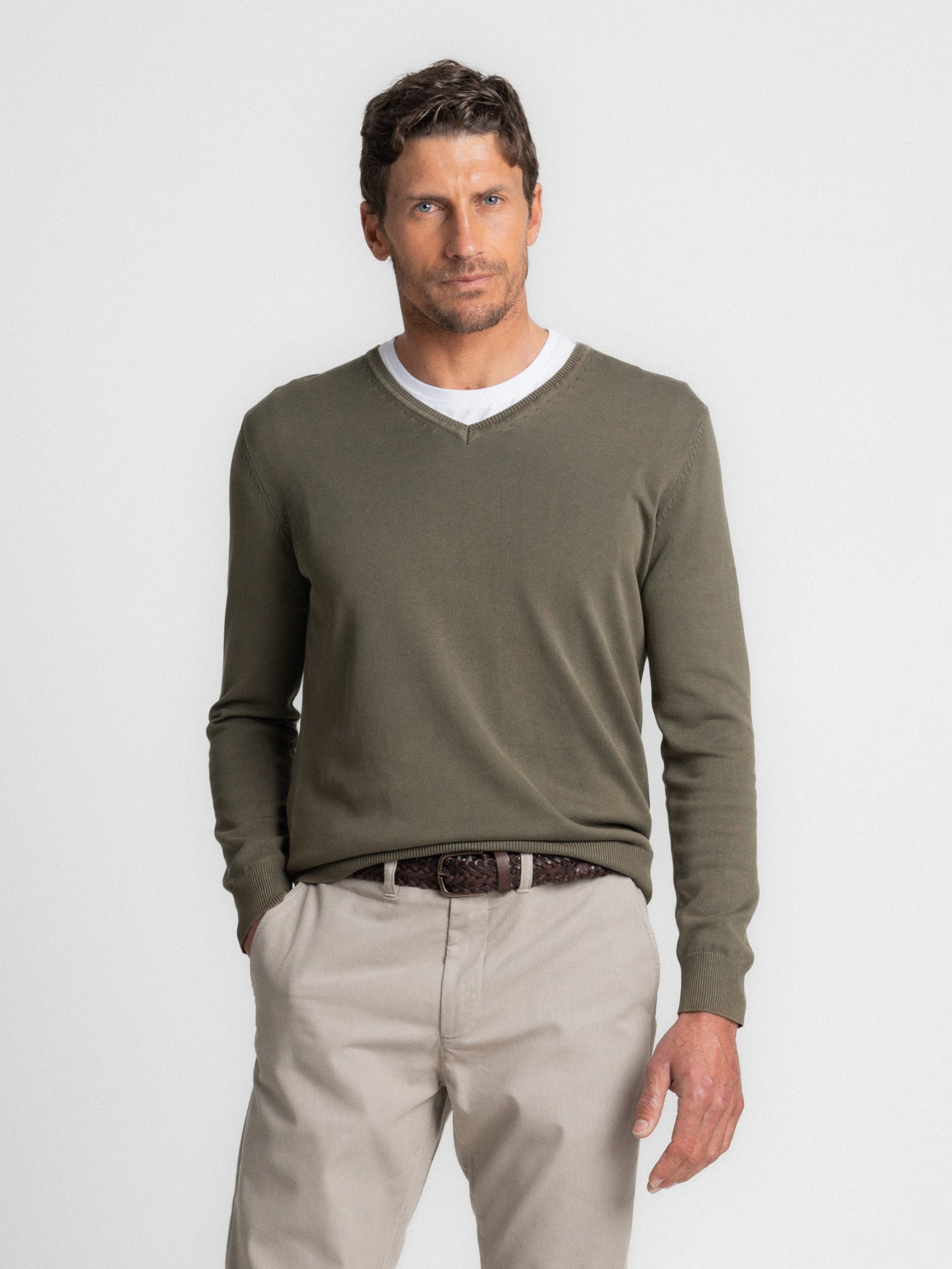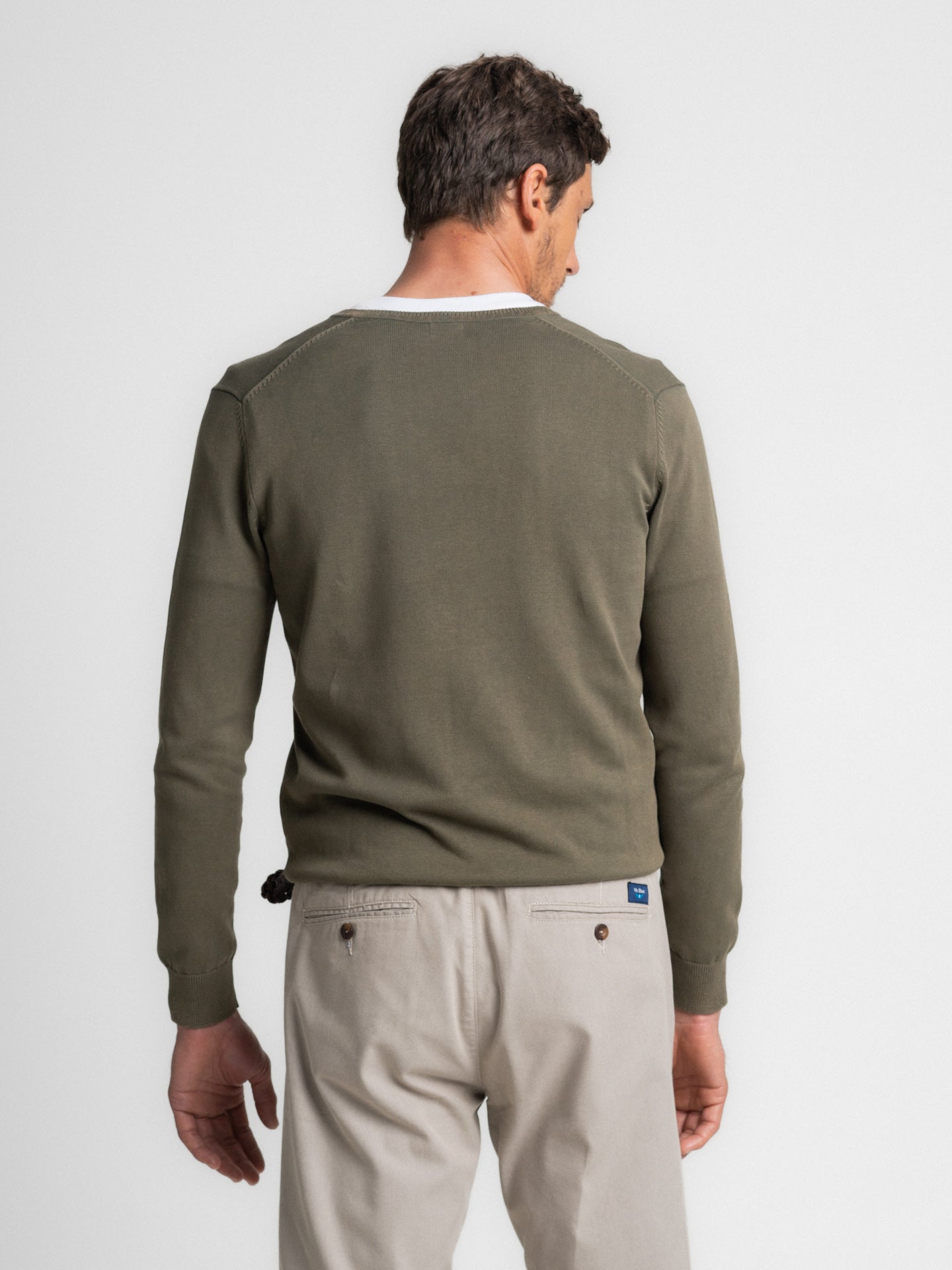 Suéter fino de algodón verde con cuello en V