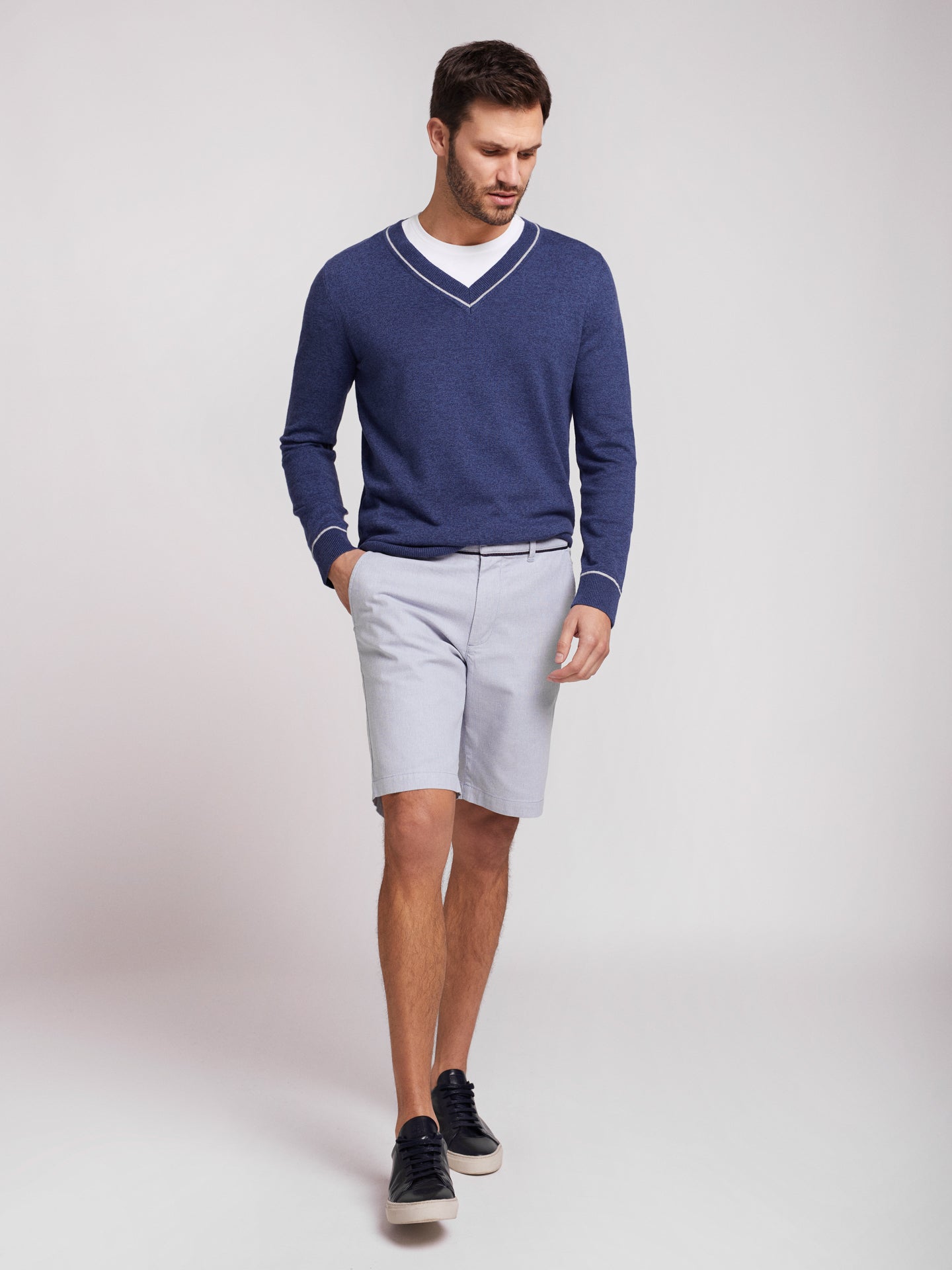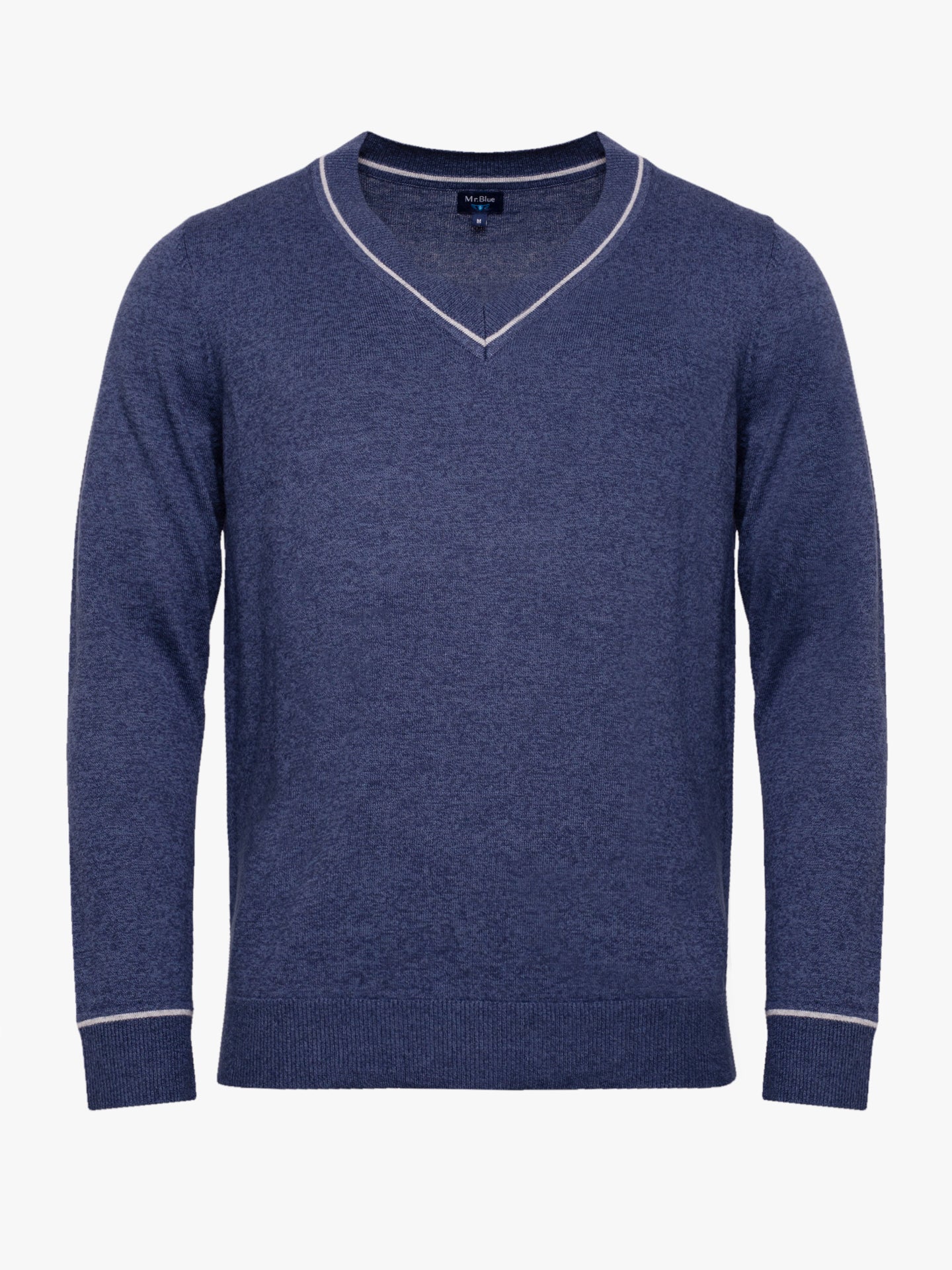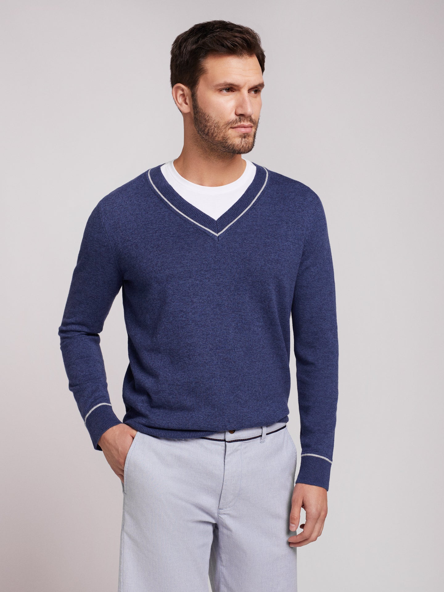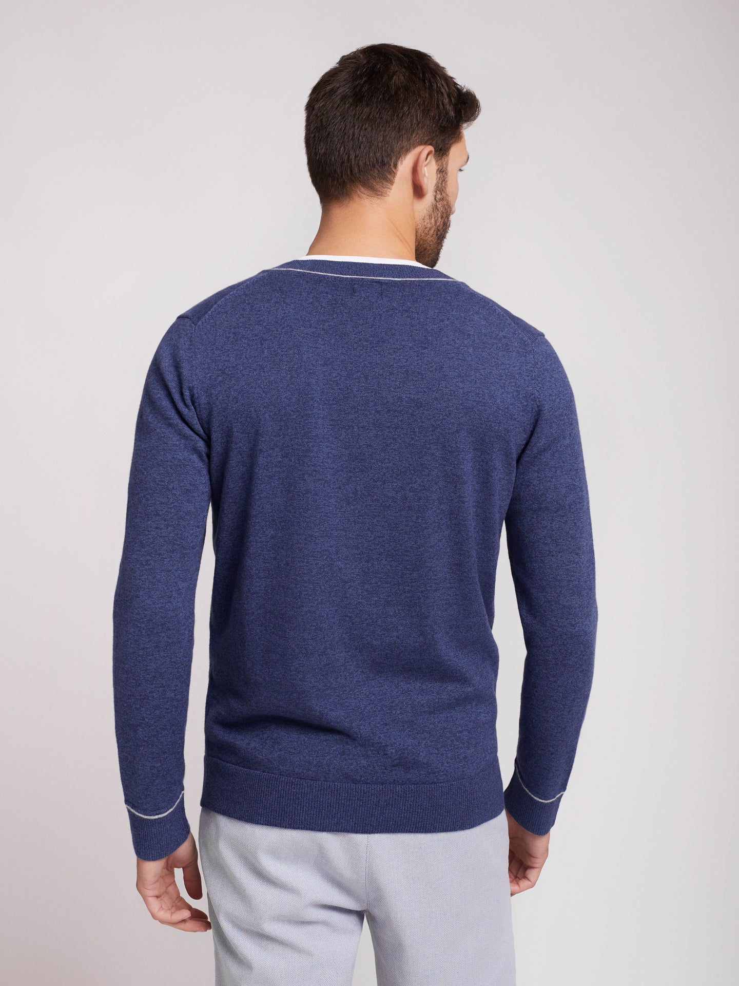 Suéter de hombre de algodón y cachemir de color azul con cuello en pico y detalle de escote y puños en color gris.