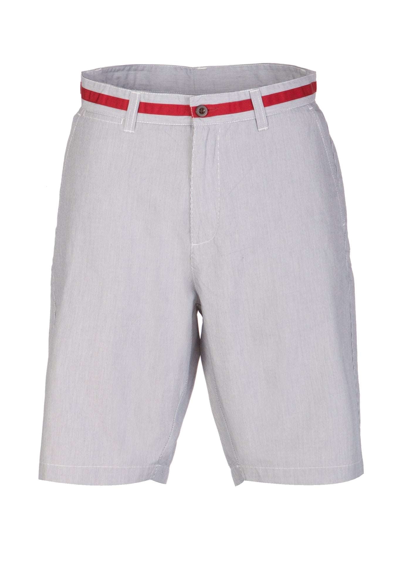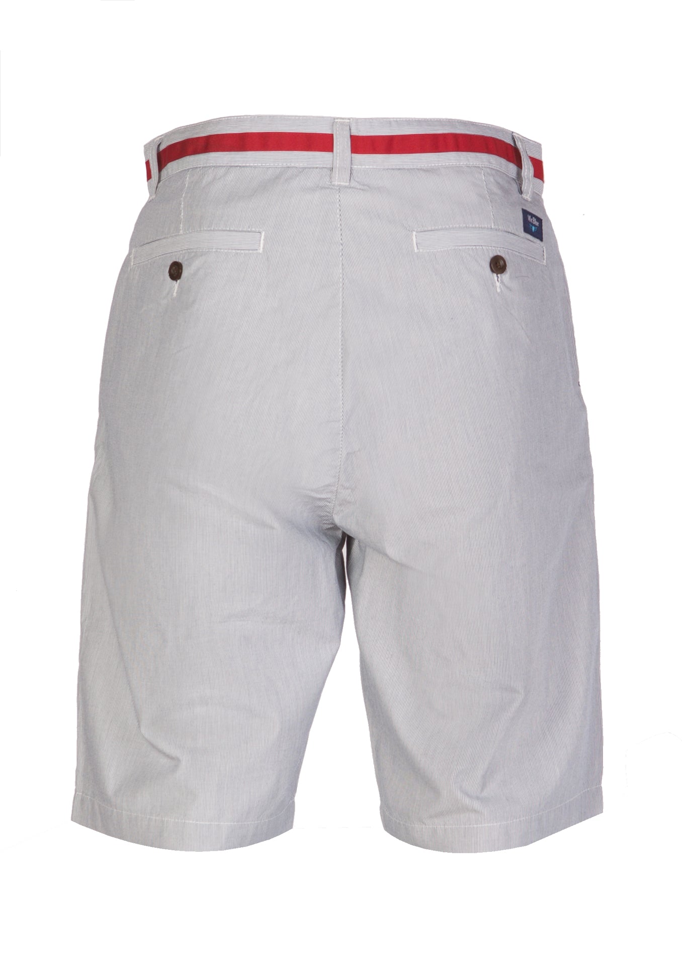 Bermudas Homem 100% Algodão Oxford falso liso azul cinza com interior cós riscas e mil raias azul e branco. Detalhe bolsos traseiros em Twill em azul marinho Ideais para dias mais quentes ou para fim-de-semana descontraído