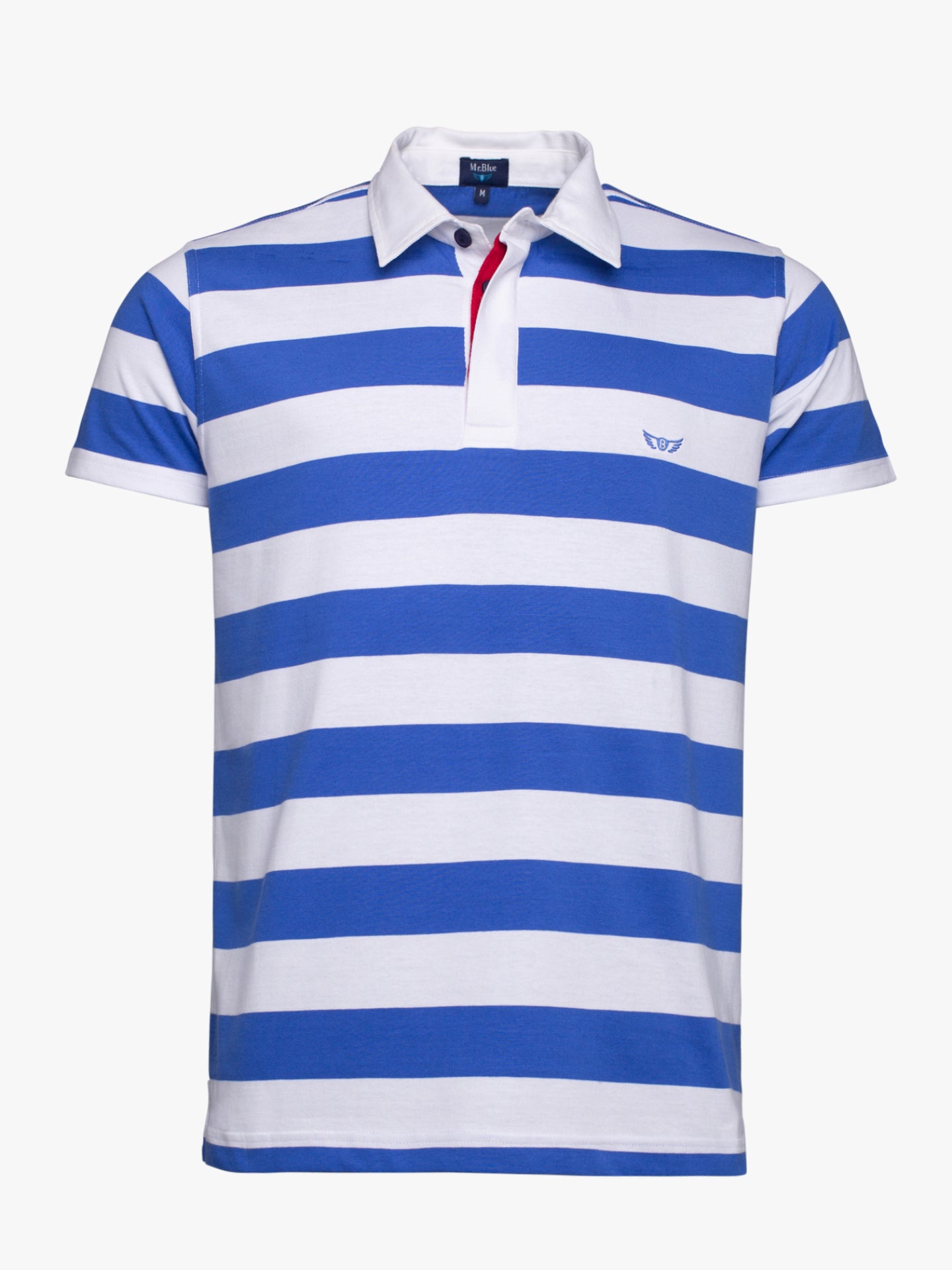 Rugby às riscas azul e branco de homem manga curta com logo em azul. Carcela e colarinho em branco com detalhe em vermelho.