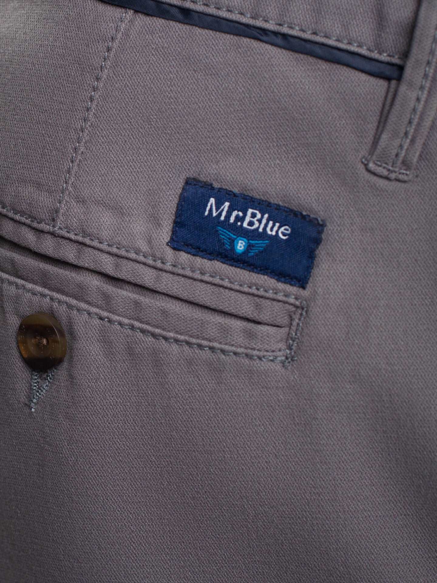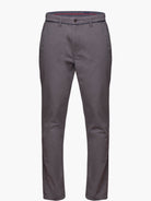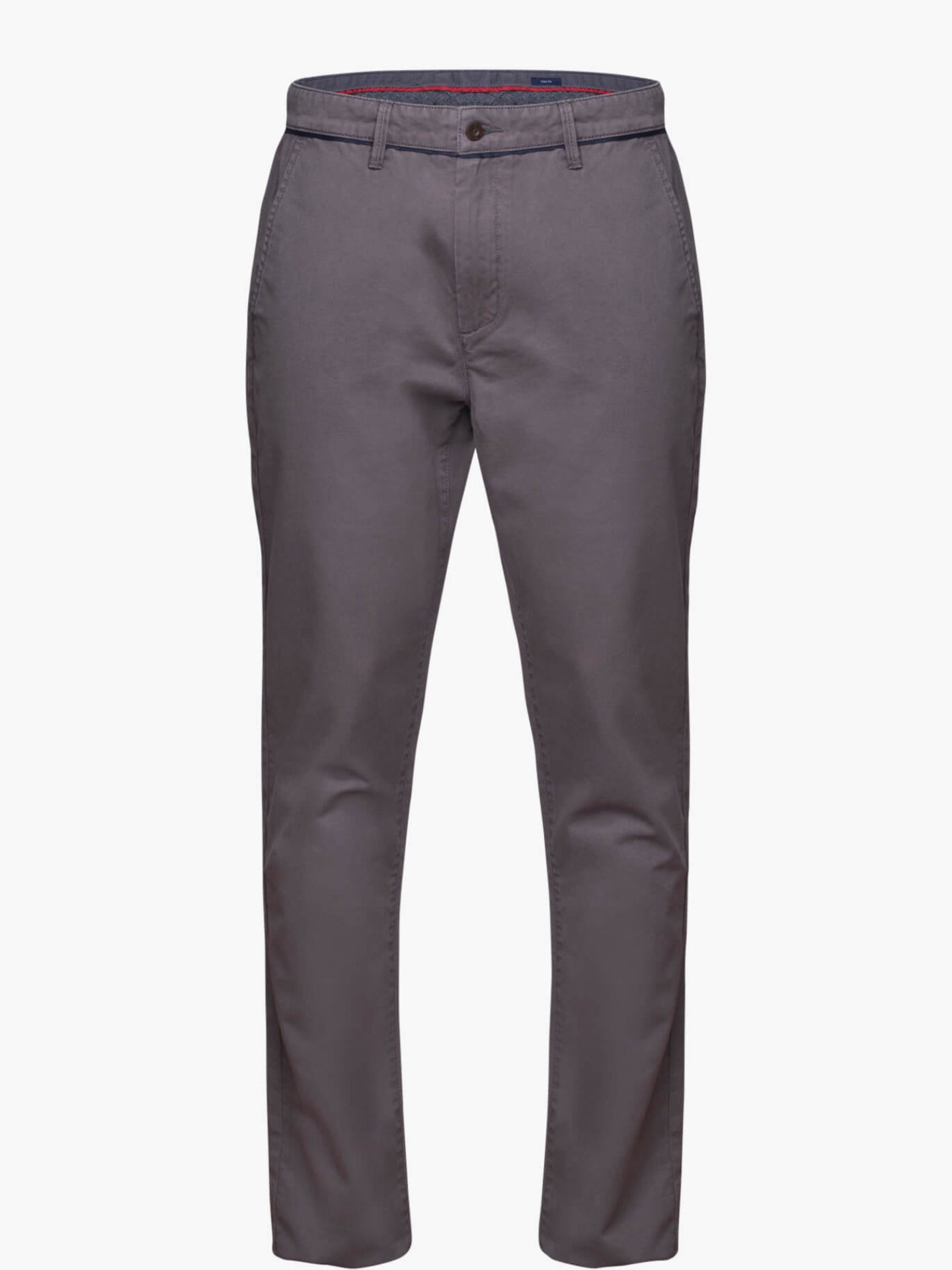 Calças chino para homem cinzento escuro, confecionadas em tecido algodão. Corte slim, fecho de botão e fecho de correr oculto por carcela, dois bolsos laterais, dois bolsos com casa de botão abotoados atrás em contraste e presilhas para cinto.
