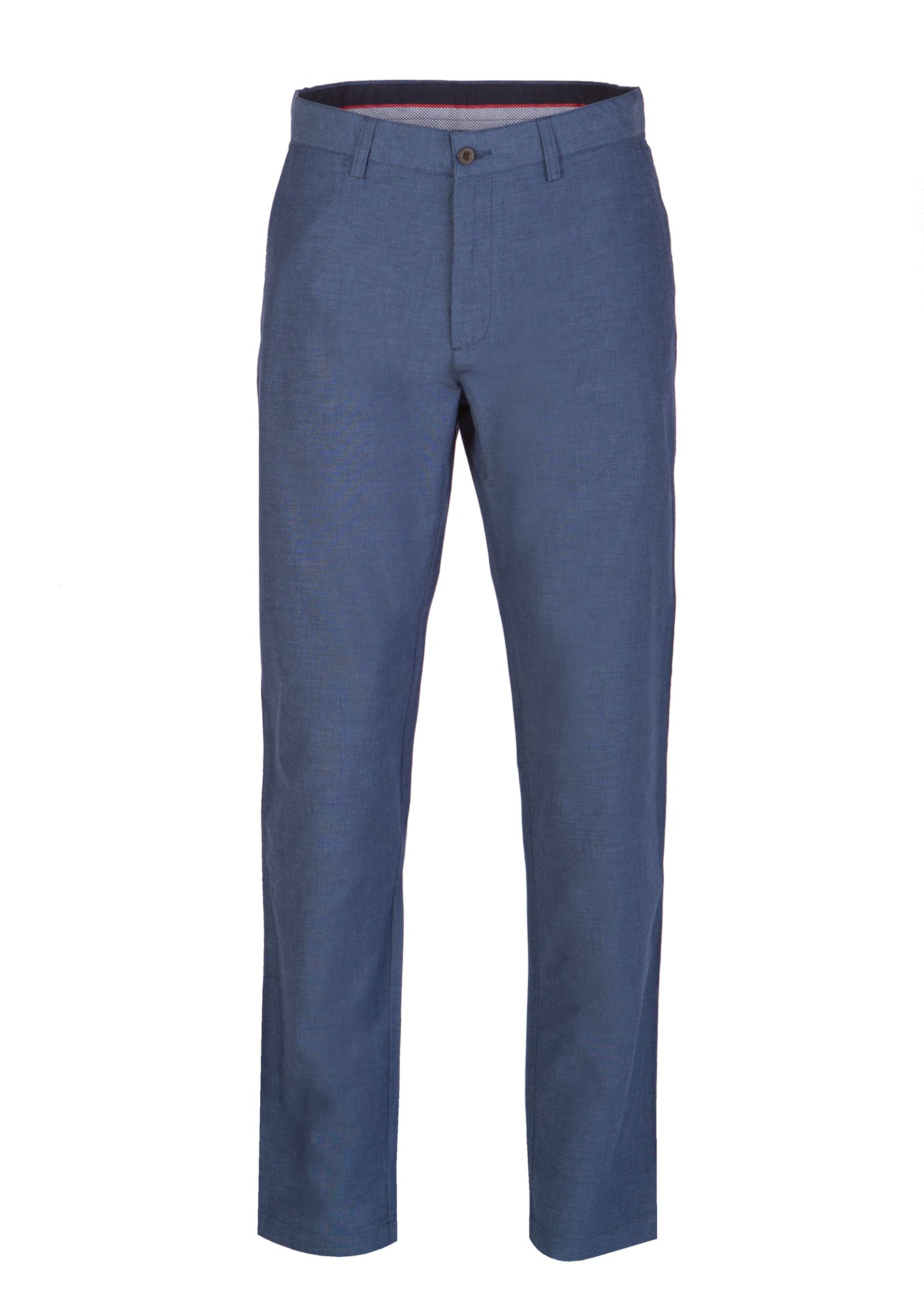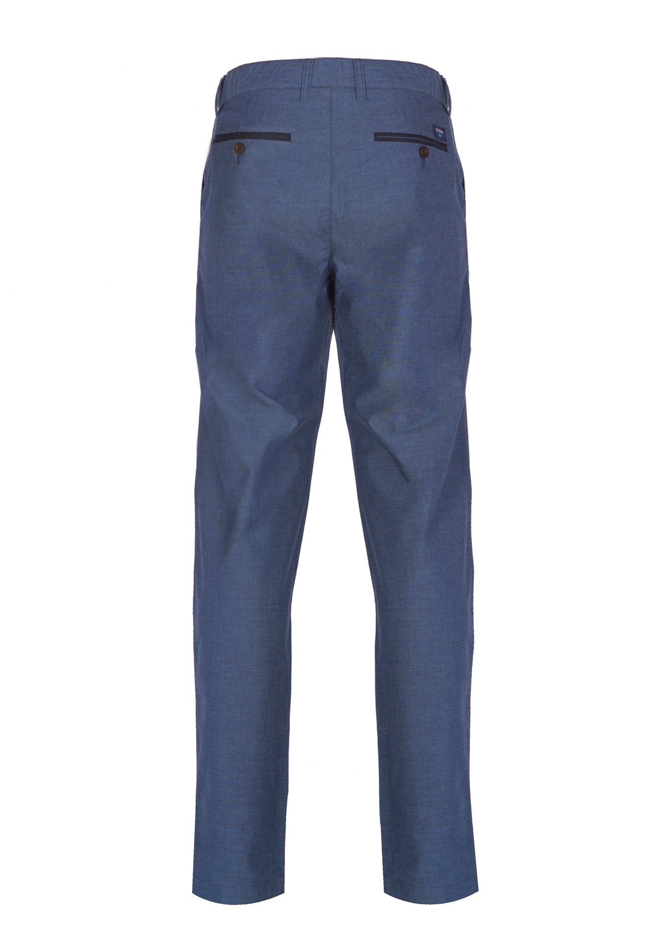 Calças Chinos Homem 100% Algodão azul escuro com textura e detalhe no cós. Corte Tailored Fit. Muito confortáveis, são a escolha certa para os dias mais quentes.