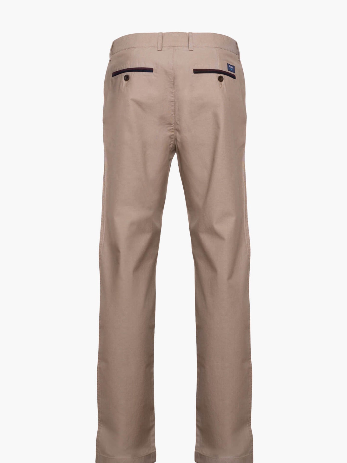 Calças Chinos Homem 100% Algodão Oxford beje. Bolsos traseiros em twill bordeaux e azul marinho. Interior cós mil raias e riscas castanho e branco. Corte Tailored Fit. Muito confortáveis, são a escolha certa para os dias mais quentes