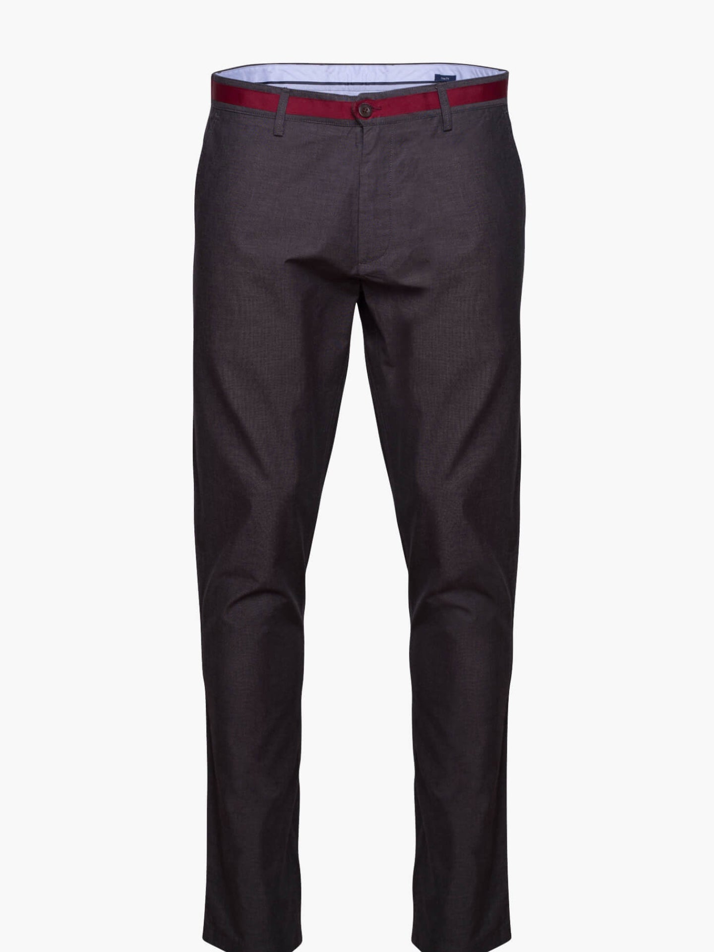 Calças Chinos Homem 100% Algodão Fil-a-fil cinzento com tape no cós em bordeaux. Interior cós mil raias e riscas azul e branco. Corte Tailored Fit. Muito confortáveis, são a escolha certa para os dias mais quentes.