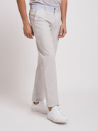 Calças Chino bege claro homem 100% algodão. Cós às riscas azuis e brancas. Corte regular, fecho de botão e fecho de correr oculto por carcela, dois bolsos laterais e um bolso pequeno. Dois bolsos com casa de botão abotoados atrás e presilhas para cinto.