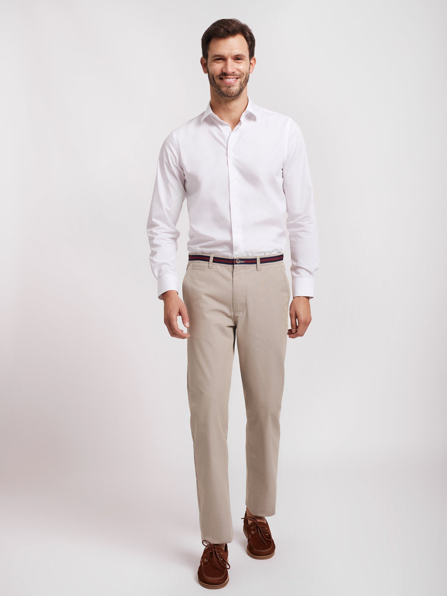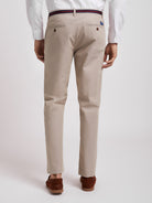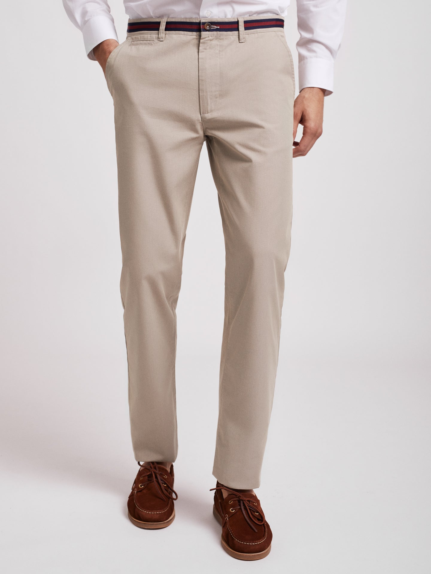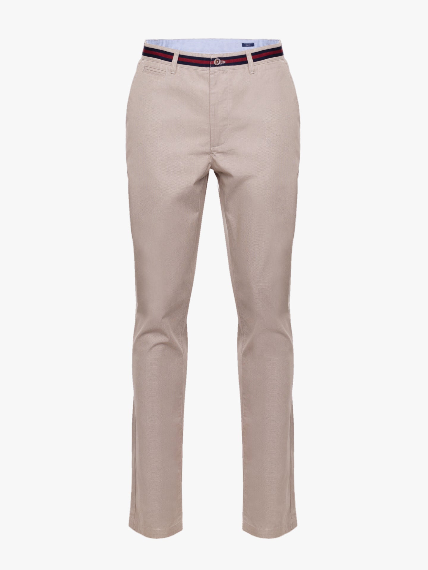 Calças Chino bege homem 100% algodão. Tape no cós em azul marinho e bordeaux. Corte slim, fecho de botão e fecho de correr oculto por carcela, dois bolsos laterais e um bolso pequeno. Dois bolsos com casa de botão abotoados atrás e presilhas para cinto.