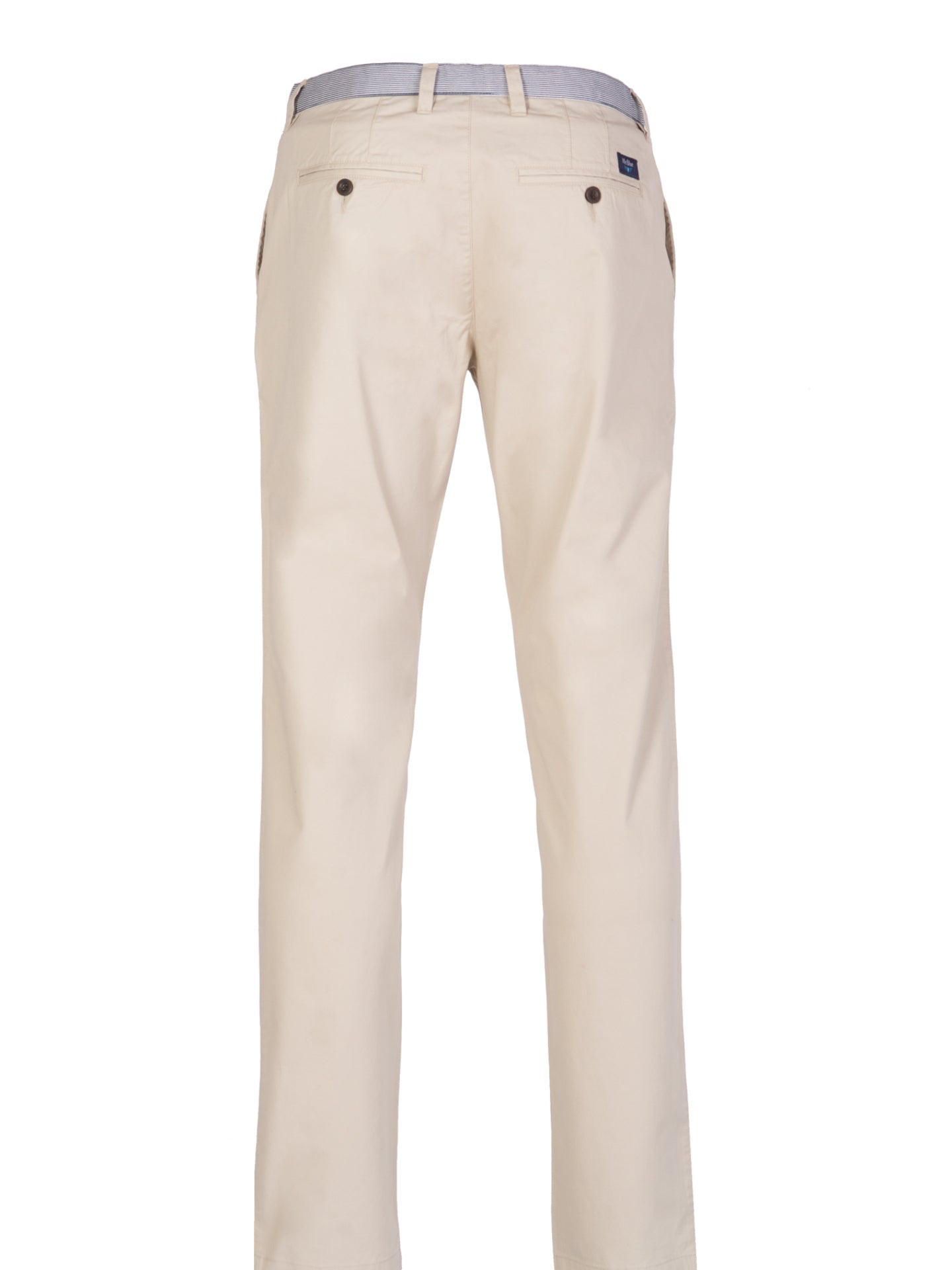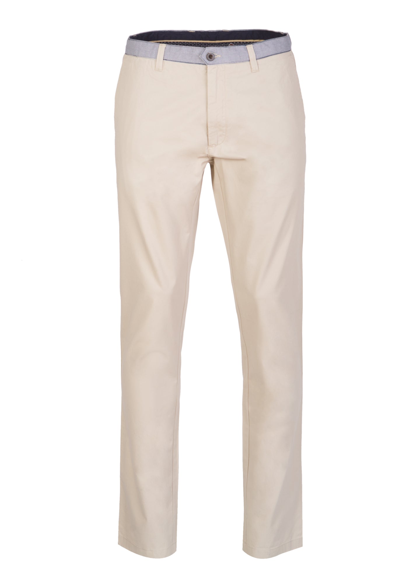 Calças Chinos Homem 100% Algodão Slim Fit beje com tape no cós às riscas azul e branco. Muito confortáveis, são a escolha certa para os dias mais quentes.