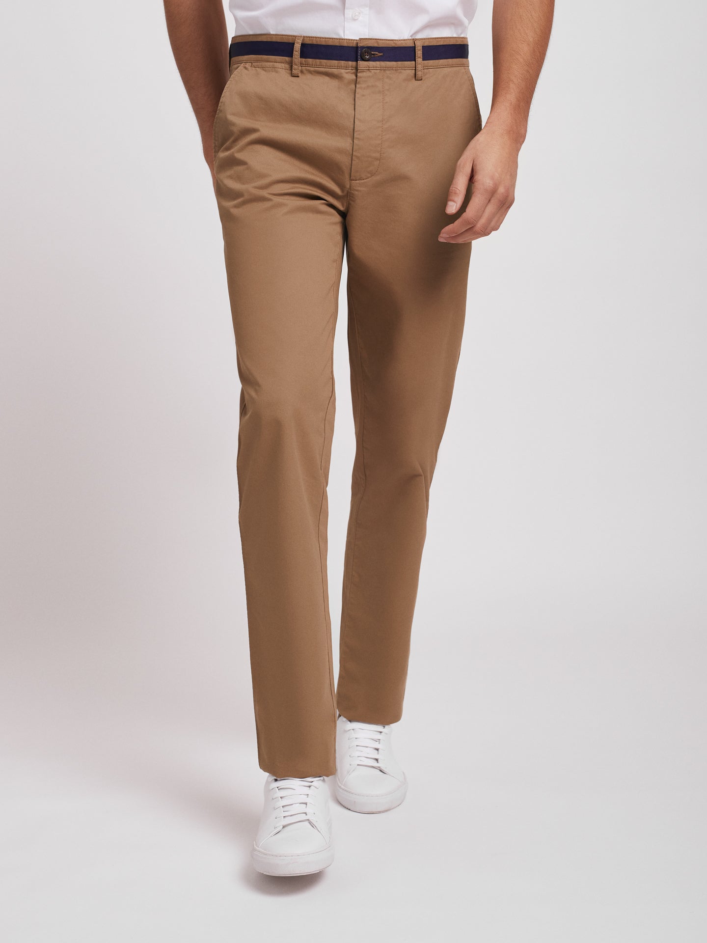 Calças Chino camel homem 100% algodão. Tape no cós azul marinho. Corte regular, fecho de botão e fecho de correr oculto por carcela, dois bolsos laterais e um bolso pequeno. Dois bolsos com casa de botão abotoados atrás e presilhas para cinto.