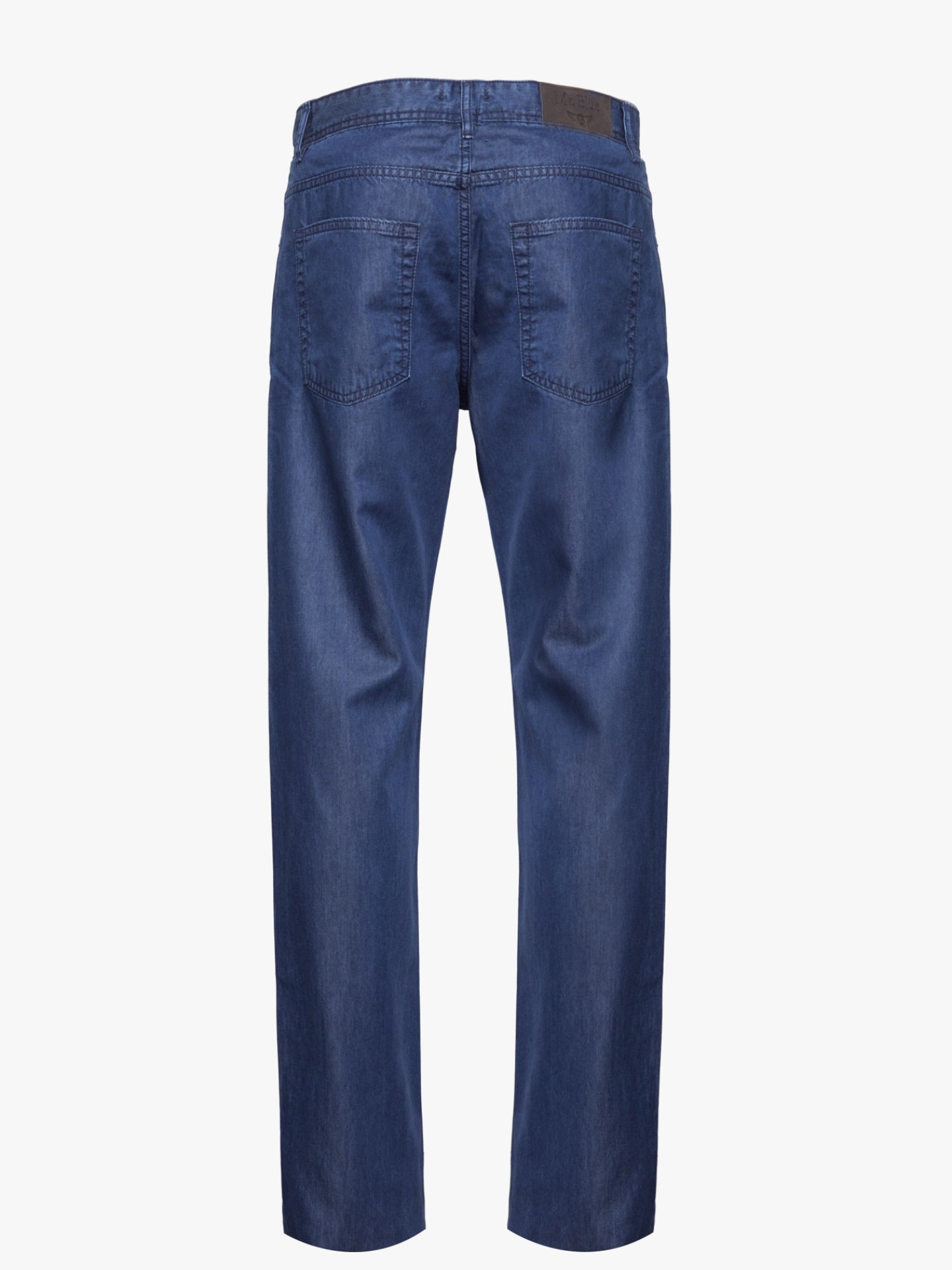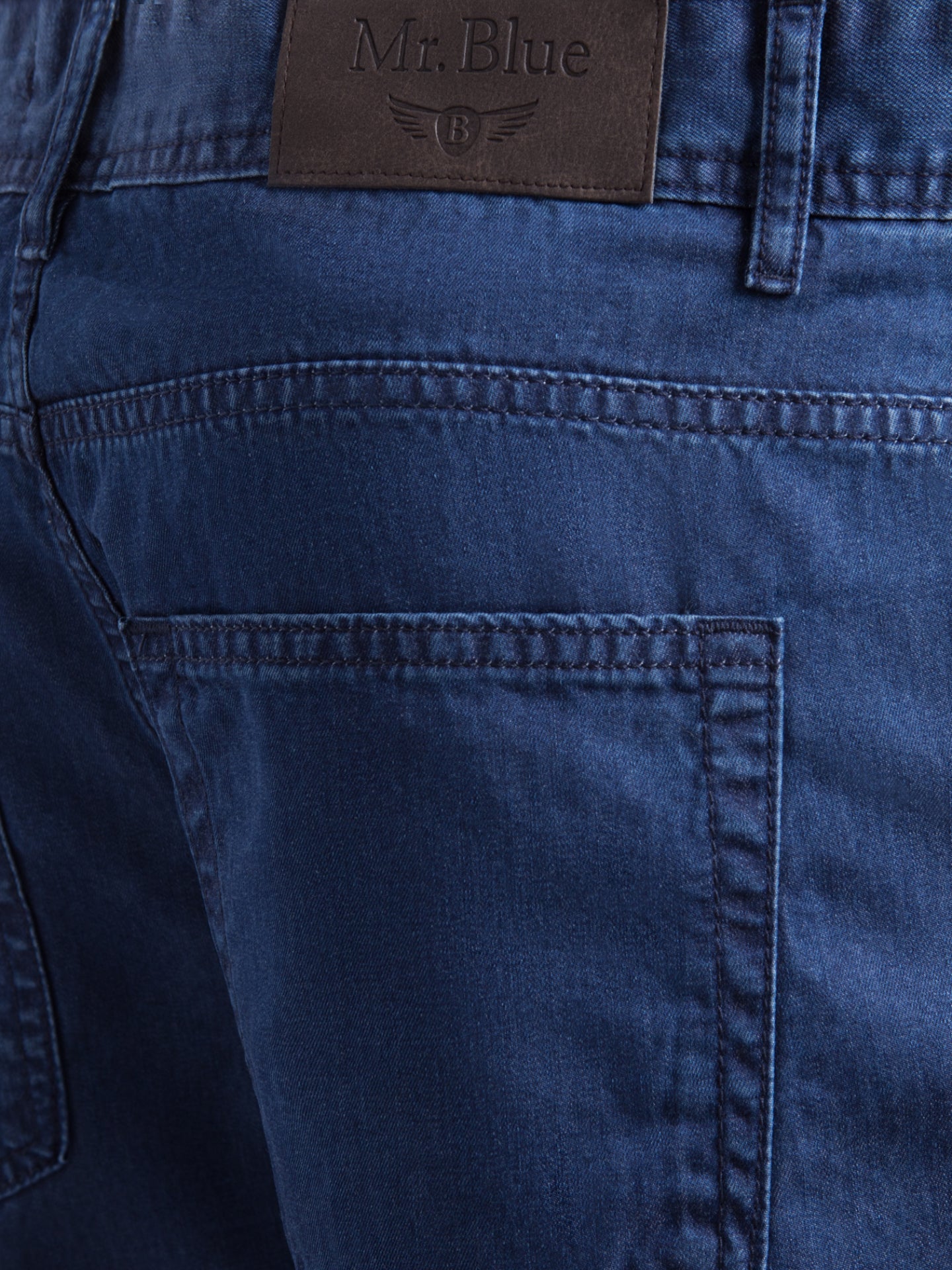 Calças de ganga homem em algodão e tencel cintura subida azul denim com lavagem. Muito confortáveis, são a escolha certa para os dias mais quentes