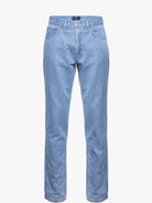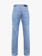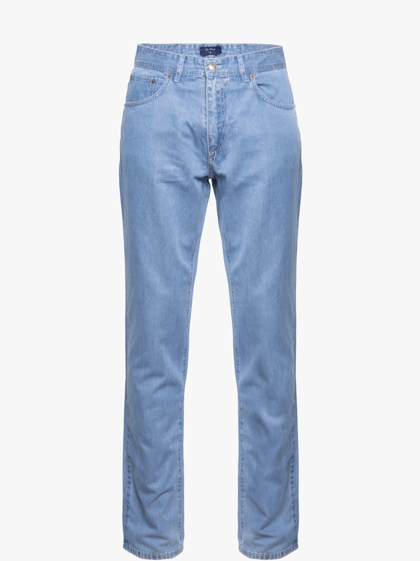 Calças de ganga homem em algodão e tencel cintura subida azul claro com lavagem. Muito confortáveis, são a escolha certa para os dias mais quentes