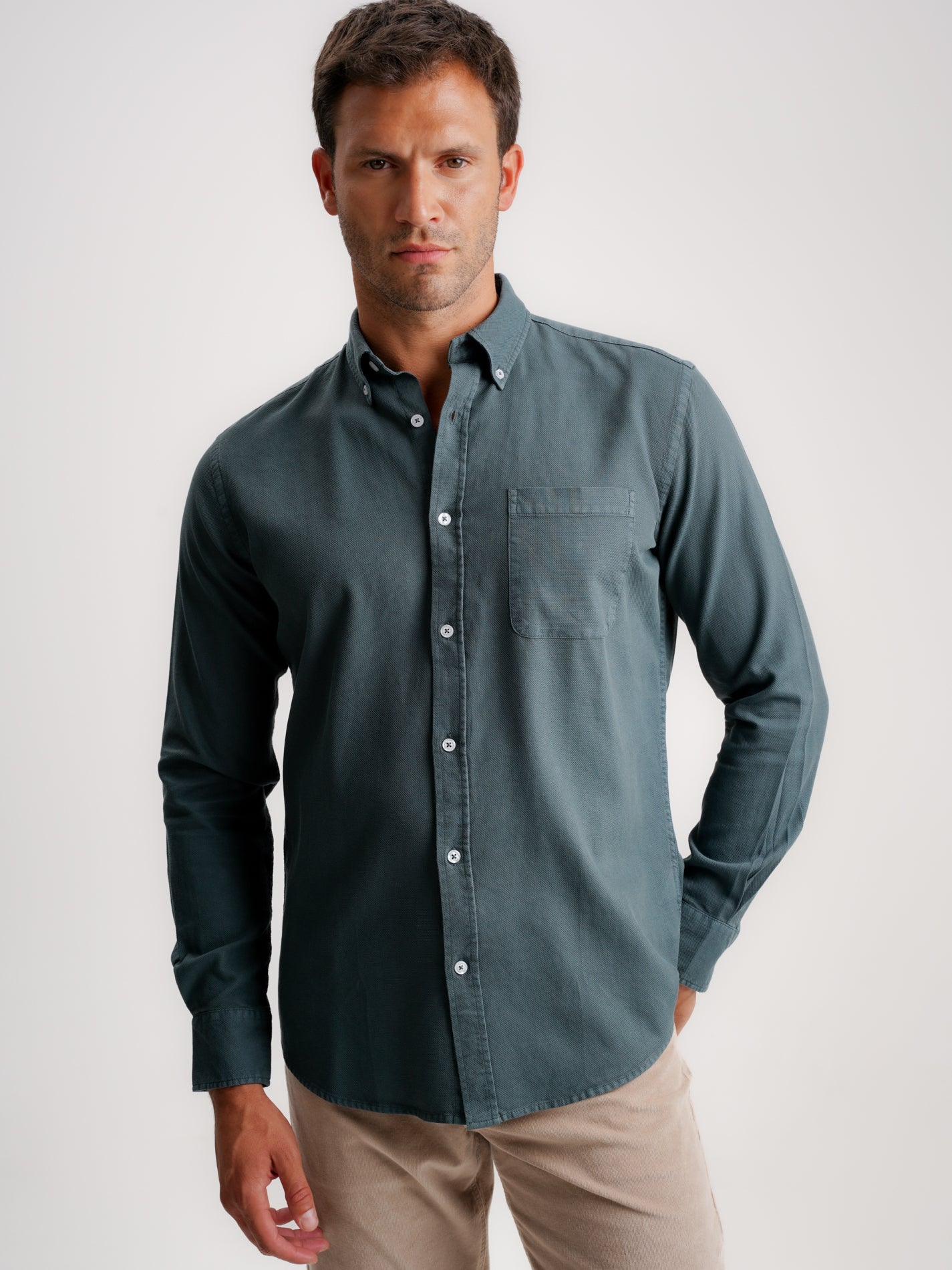 Camisa Regular Fit Estruturada Azul Manga Comprida Com Bolso Lisa