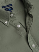 Camisa de homem 100% algodão verde seco. Efeito lavado, corte regular, colarinho italiano, fecho mediante abotoadura frontal e manga comprida com acabamento em punho abotoado.