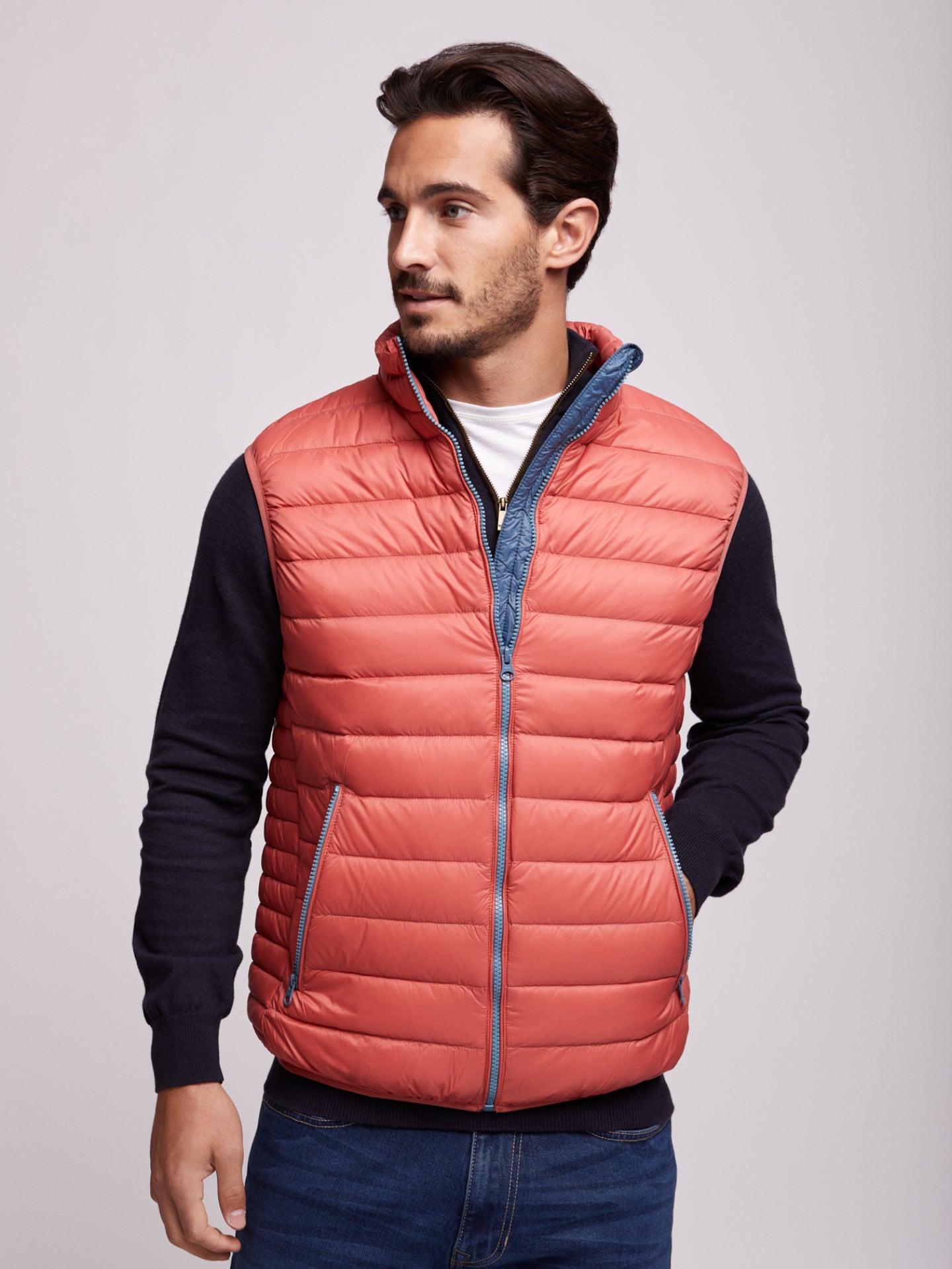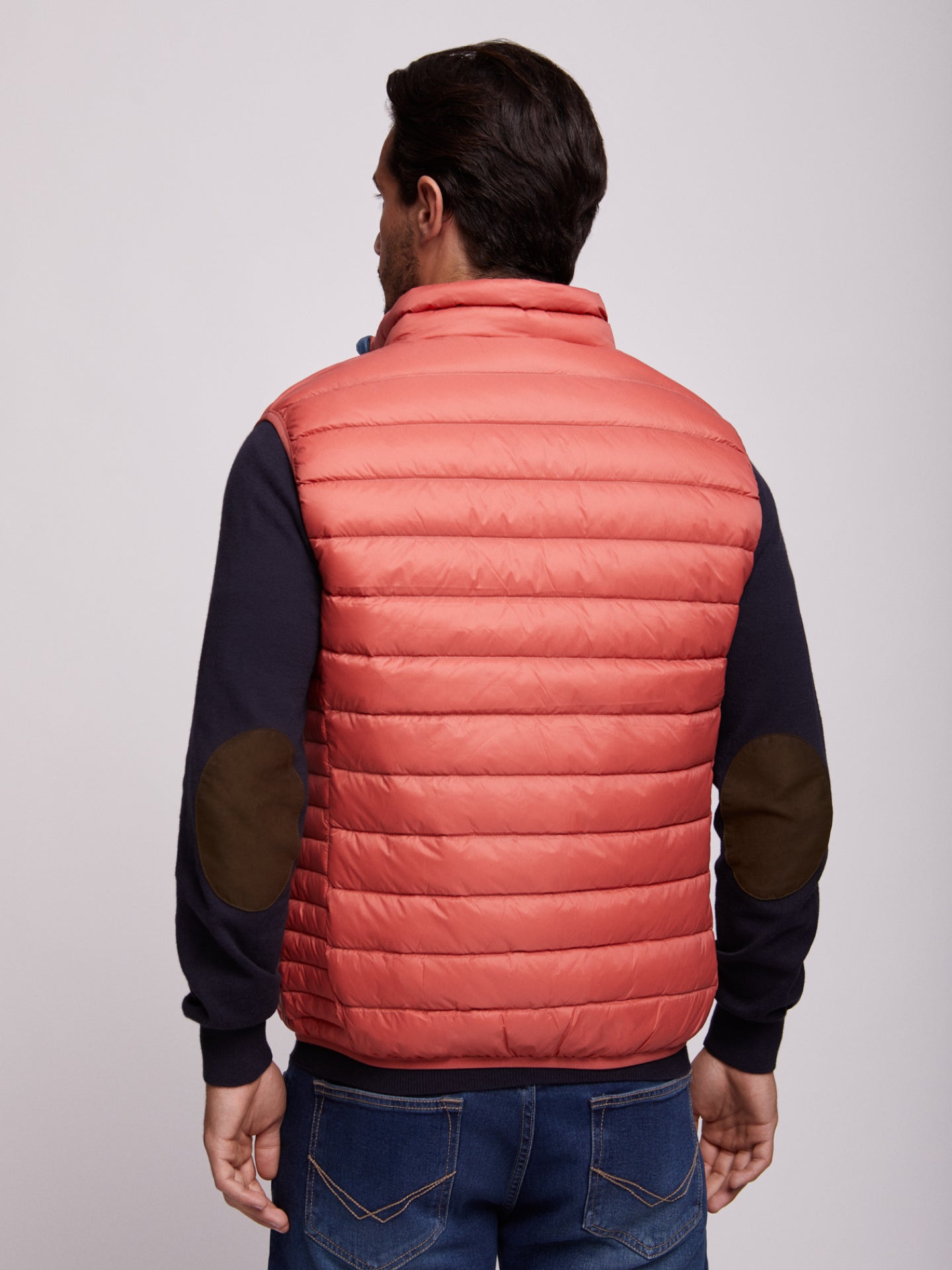 Colete acolchoado para homem tom salmão. Corte direito, gola alta, fecho mediante fecho de correr frontal, dois bolsos laterais de fecho de correr, sem mangas, acabamentos elásticos, forro interior em verde 2 bolsos interiores