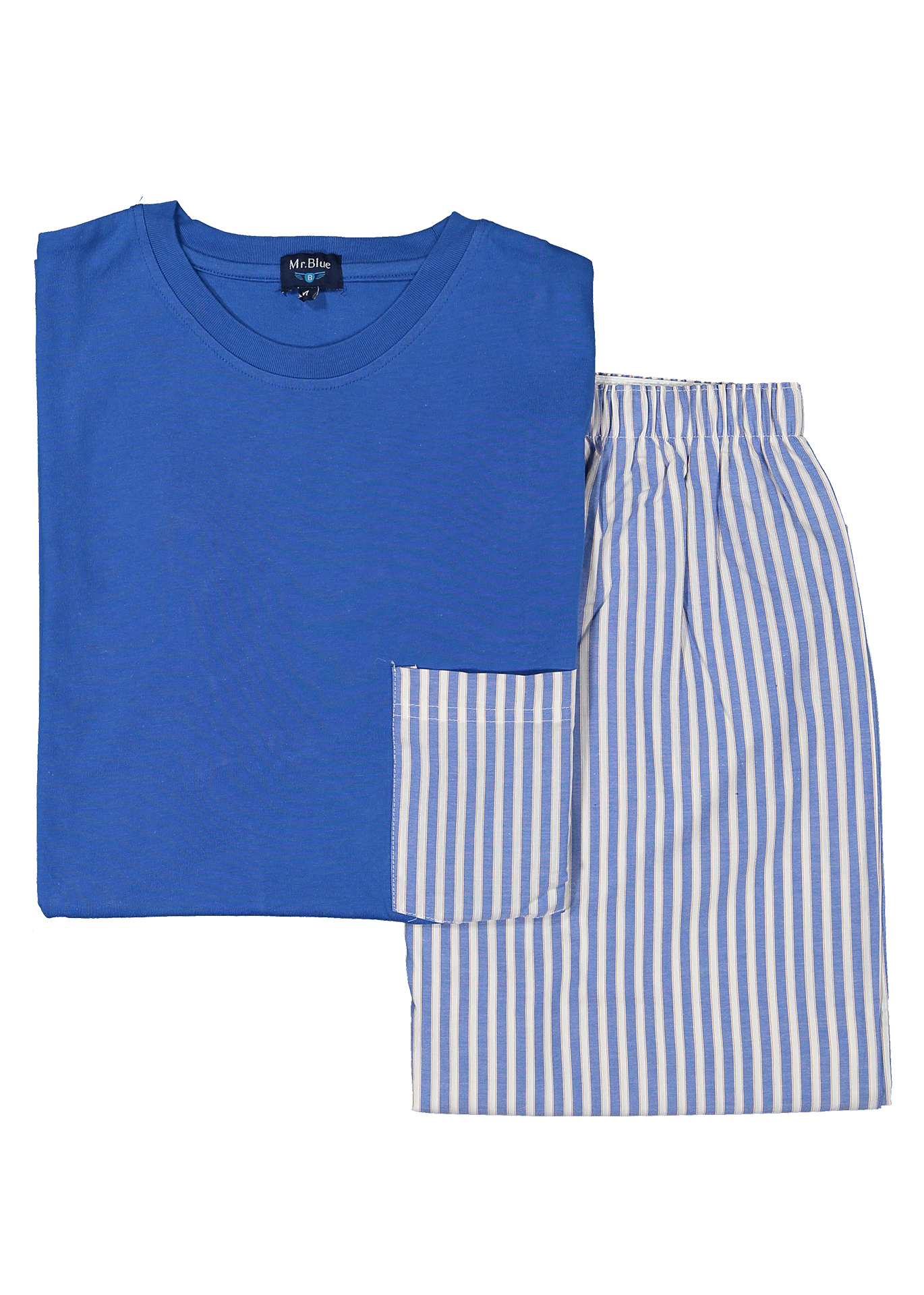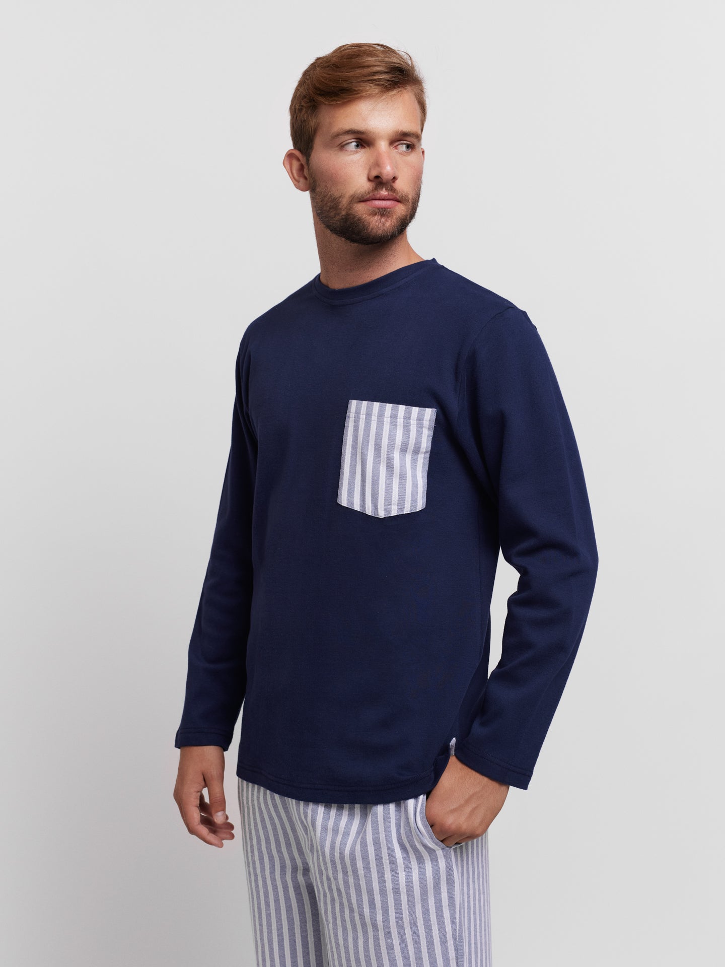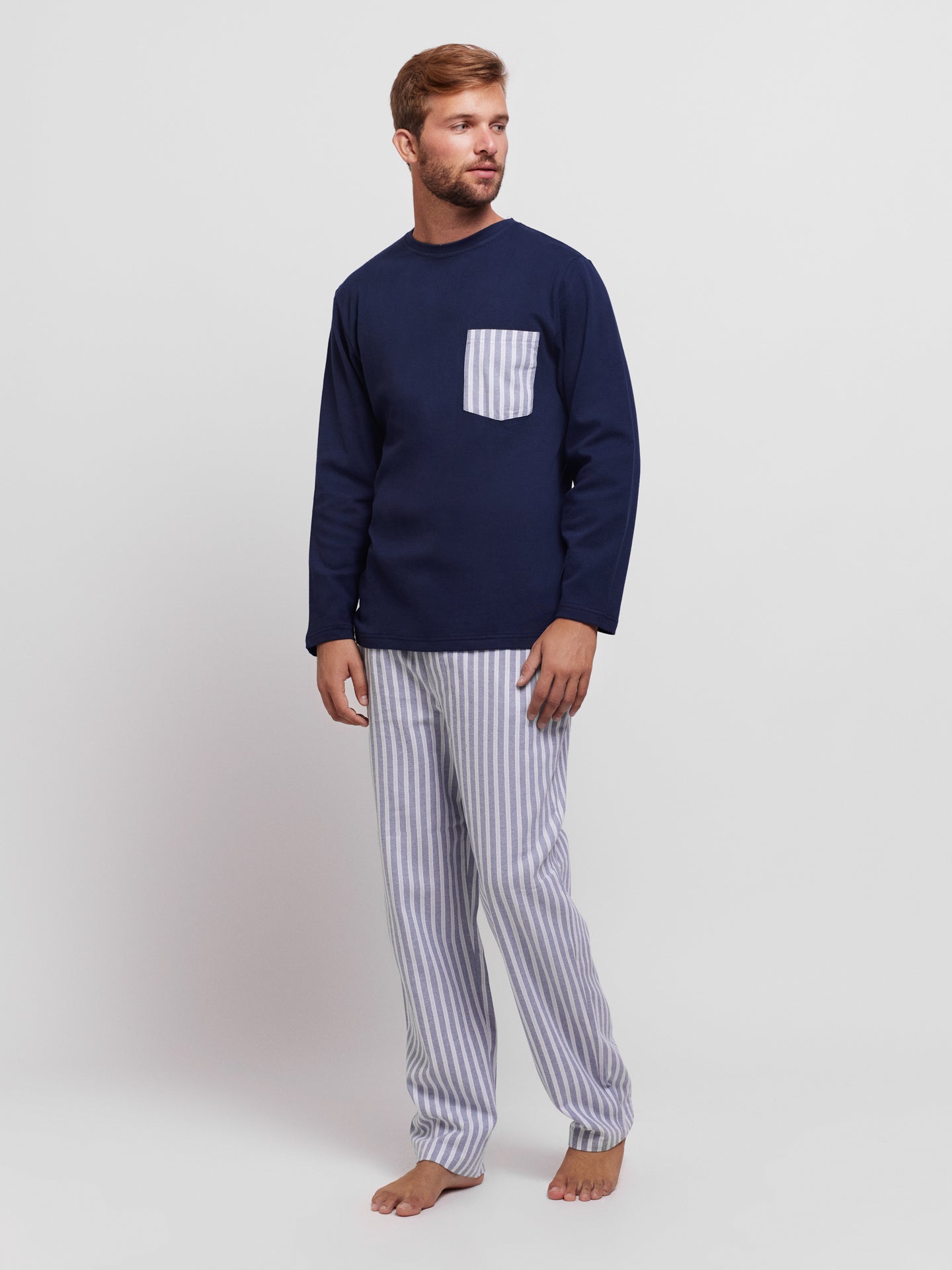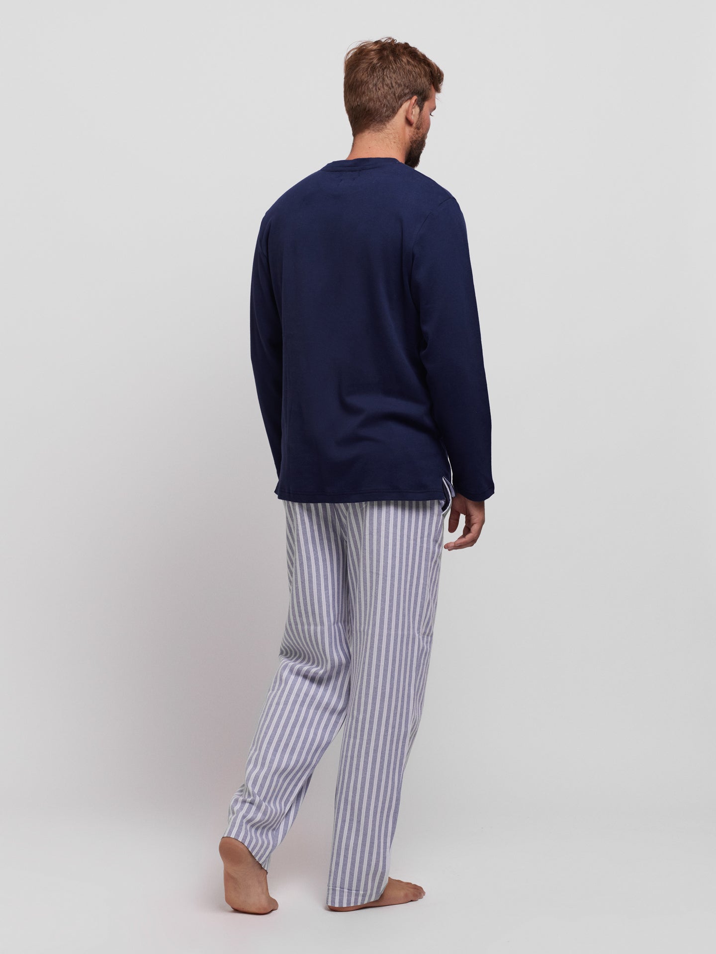Pijama clássico manga comprida de riscas finas azul claro e branco